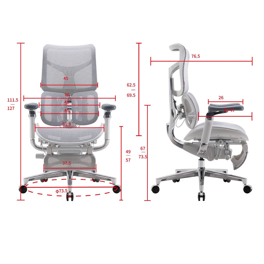 - Podłokietnik: Regulowany 6D (Góra - dół 6,5 cm, przód - tył 5 cm, pochył na boki - 75°, pionowo 35°, przesunięcie poziomo, zsynchronizowane z oparciem),