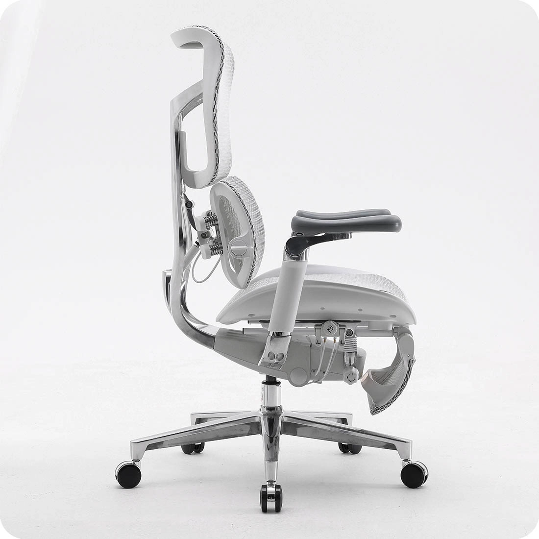Krzesło biurowe Spacetronik SPRINGLE 66 zostało wyposażone w zaawansowany, dynamiczny mechanizm podparcia pleców w odcinku lędźwiowym. Przypomina on swoim wyglądem skrzydła ptaka lub motyla - składa się z dwóch osobno działających części. Każda z nich została wyposażona w dwie elastyczne sprężyny, które automatycznie dostosowują swoją pozycję. Tak by dopasować się do kształtu Twoich pleców. Gdy natomiast wstaniesz z krzesła, powrócą one do swojej naturalnej pozycji. Tak, więc z krzesła bez problemu może korzystać kilka osób, bez potrzeby ręcznej regulacji poduszki lędźwiowej. Sprawia to, że jest to produkt bardzo ergonomiczny idealny do zastosowania, chociażby w nowoczesnych biurach. Idealnie sprawdzi się również wszędzie tam, gdzie występuję system zmianowy i kilku pracowników po sobie pracuje na tym samym stanowisku. Co więcej, mechanizm podparcia pleców został również wyposażony w funkcję podnośnika gazowego. Umożliwia ona precyzyjną regulację w odcinku lędźwiowym. Po przekręceniu pokrętła znajdującego się z boku "prawego skrzydła" mechanizmu dostajesz możliwość dopasowania pochyłu podparcia pleców. Będzie automatycznie dostosowywał się pod naciskiem w zakresie 90° - 105°. Wszystko po to, żebyś mógł czerpać jak najwięcej radości z funkcjonalności fotela biurowego.