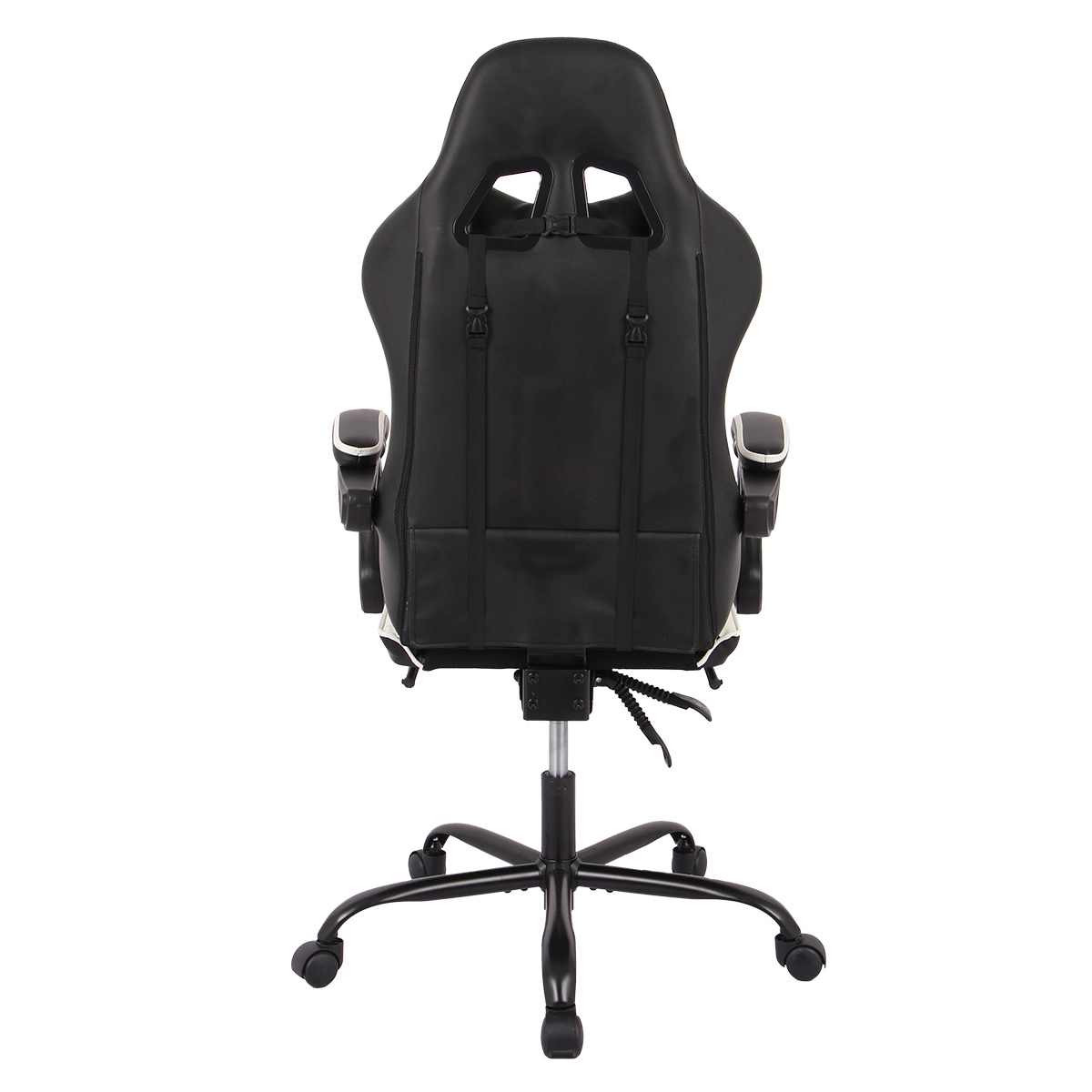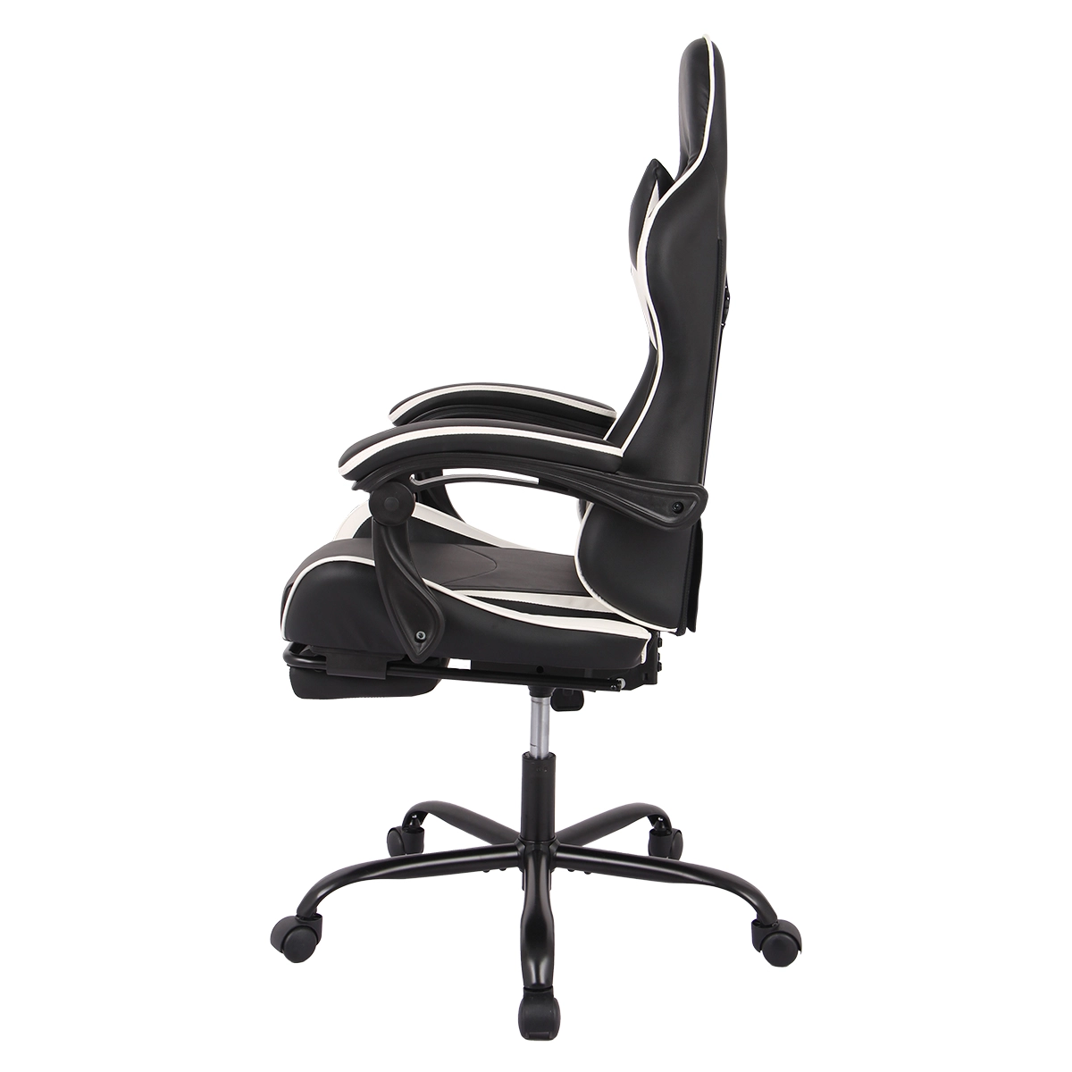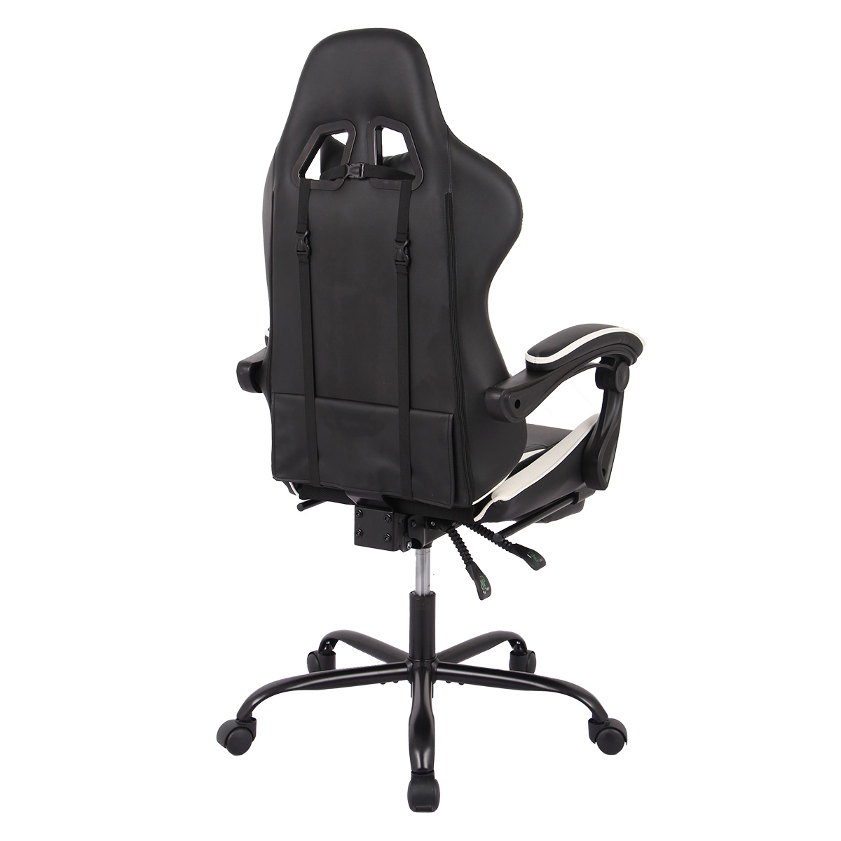 • Wygodne krzesło do biura i domu. Wyposażone w wysuwany podnóżek oraz poduszki pod odcinek lędźwiowy oraz kark. Krzesło obszyte skórą PU, siedzisko z gęstej komfortowej pianki. Kolor czarno-biały.