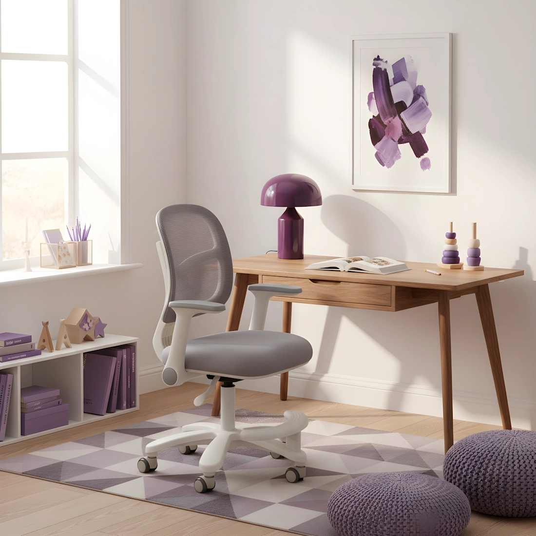 najmłodszych użytkownikach. Wyprofilowane oparcie z przewiewnej tkaniny wspiera plecy podczas nauki i zabawy.