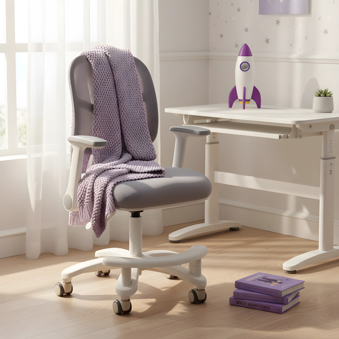 Zaawansowana regulacja wysokości pozwala dopasować krzesło do wzrostu dziecka i biurka. Stabilna podstawa posiada