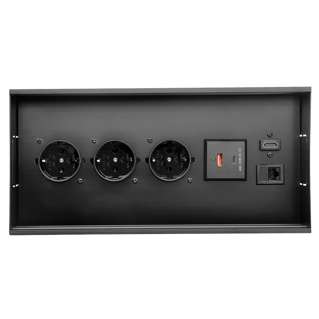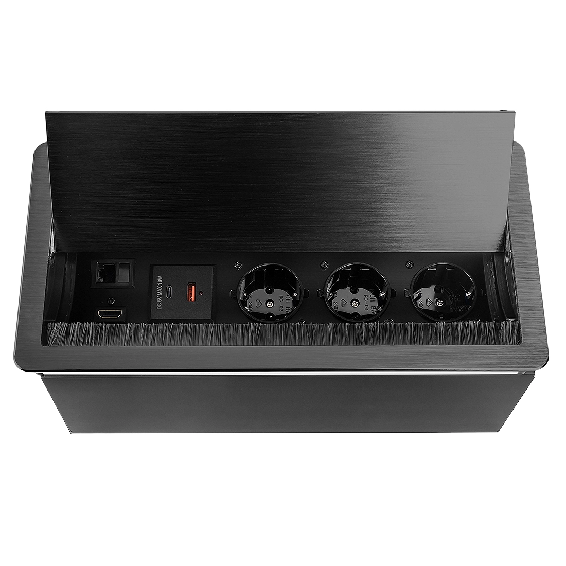 • Elegancki mediaport do montażu w blacie, otwierany. Posiada 3 gniazda elektryczne (Schuko), ładowarka usb PD gniazdo HDMI oraz gniazdo Ethernet (RJ-45). Długość kabla 1,2 m. W kolorze czarnym