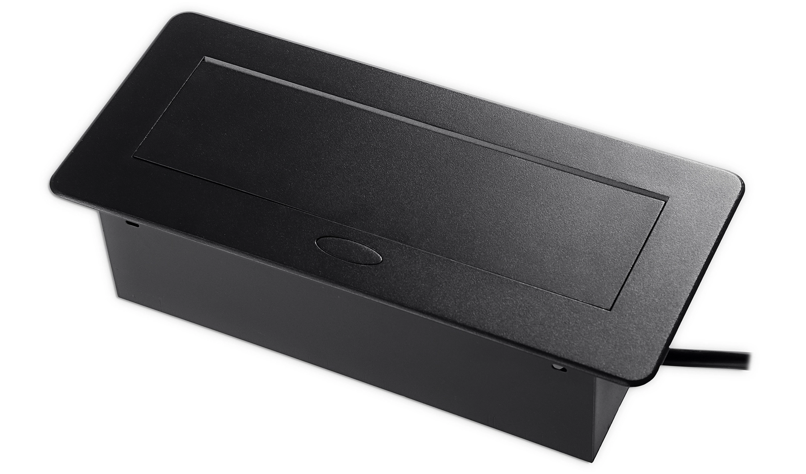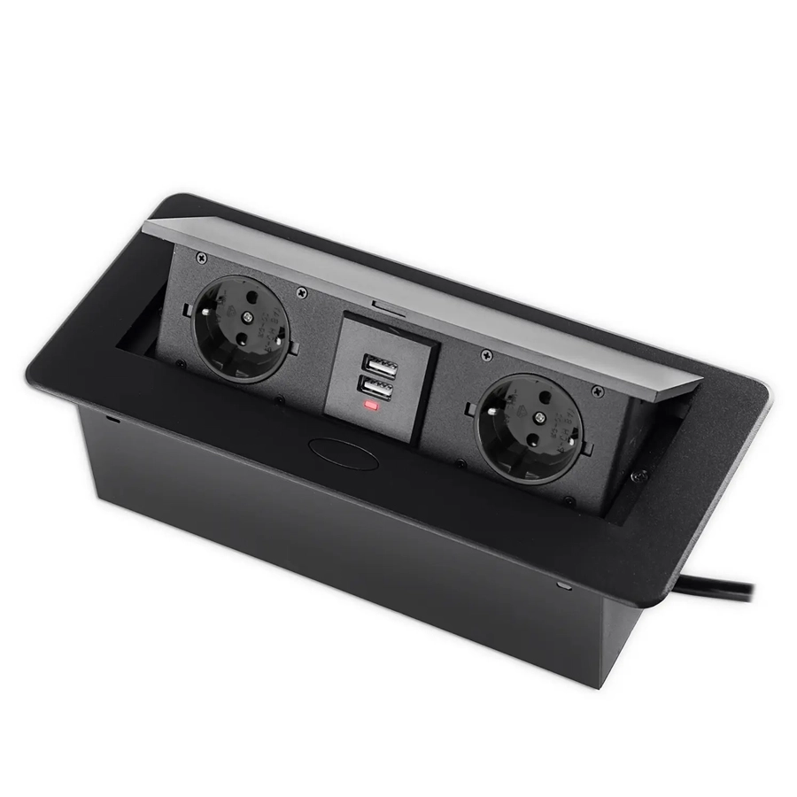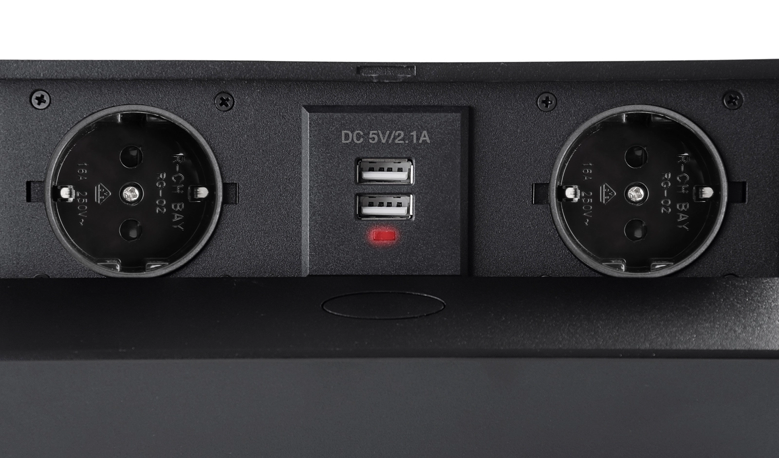 • Elegancki mediaport do montażu w blacie, otwierany przyciskiem. Posiada 2 gniazda elektryczne (schuko) oraz podwójną ładowarkę USB. Długość kabla 1,5 m. W kolorze czarnym