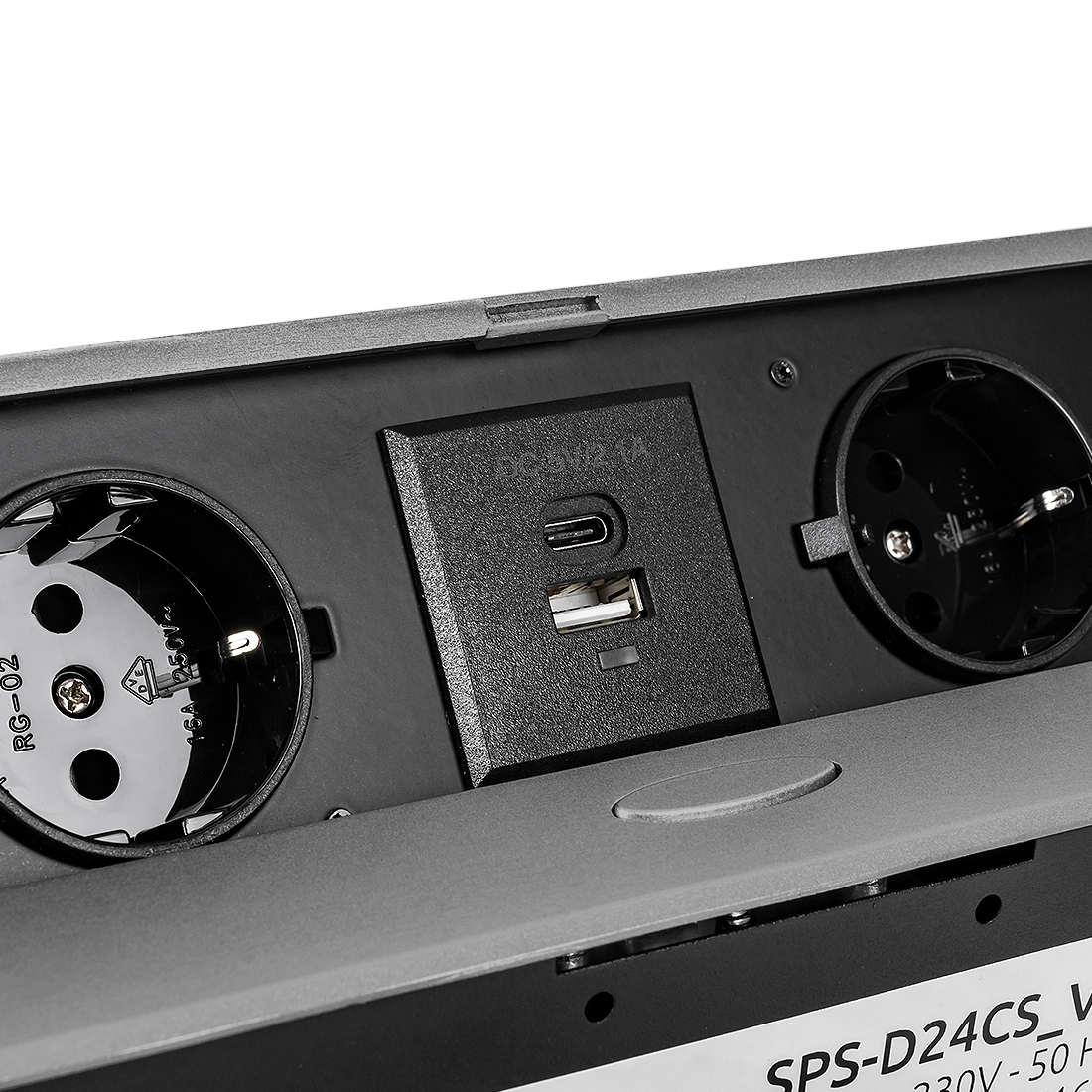 Gniazdka chowane w blacie Spacetronik ERGOLINE SPS-D24CC V2 w kolorze szarym to nowoczesne rozwiązanie, które znajduje zastosowanie w sklepach, salonach sprzedaży, salach konferencyjnych, biurach a także w domu. Naciśnij przycisk, a gniazda płynnie się otworzą. Wykonany z aluminium i wysokiej jakości komponentów. Produkt jest przeznaczony do montażu wewnątrz pomieszczeń w biurkach, blatach i stołach, zarówno w pozycji pionowej jak i poziomej, zapewniając dostęp do gniazd. Mediaport został wyposażony w 2 gniazda 110-250 V (typu niemieckiego (Schuko)) oraz ładowarkę USB-C + USB-A.