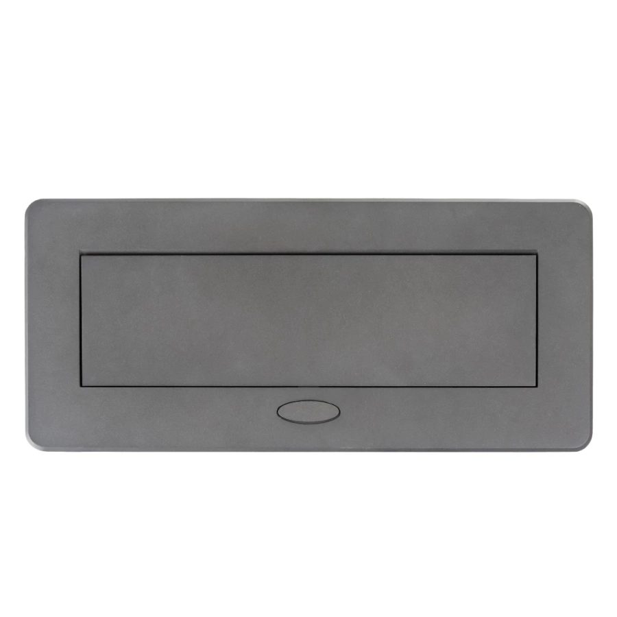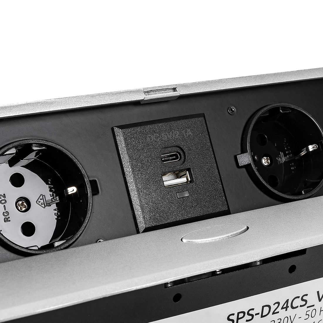• Elegancki mediaport do biurka, otwierany przyciskiem. Posiada 2 gniazda elektryczne (schuko) oraz ładowarkę USB-A oraz USB-C. Długość kabla 1,5 m. W kolorze srebrnym.