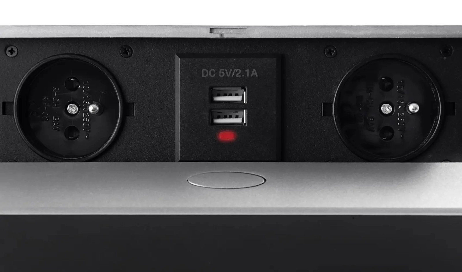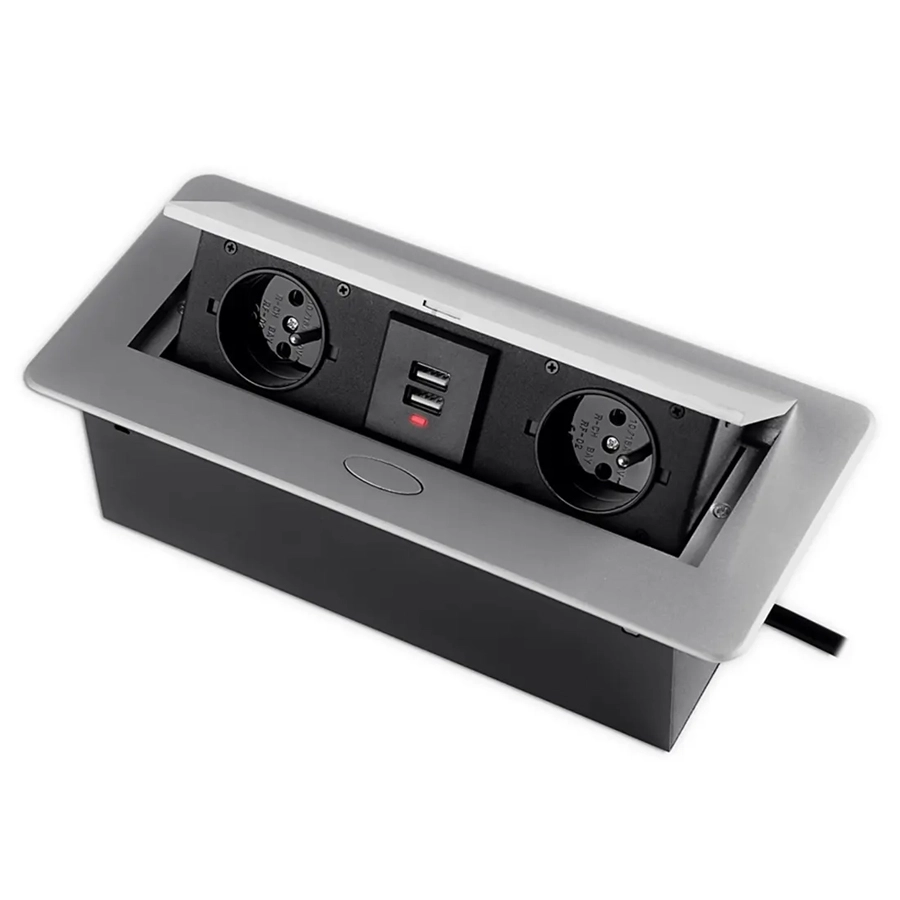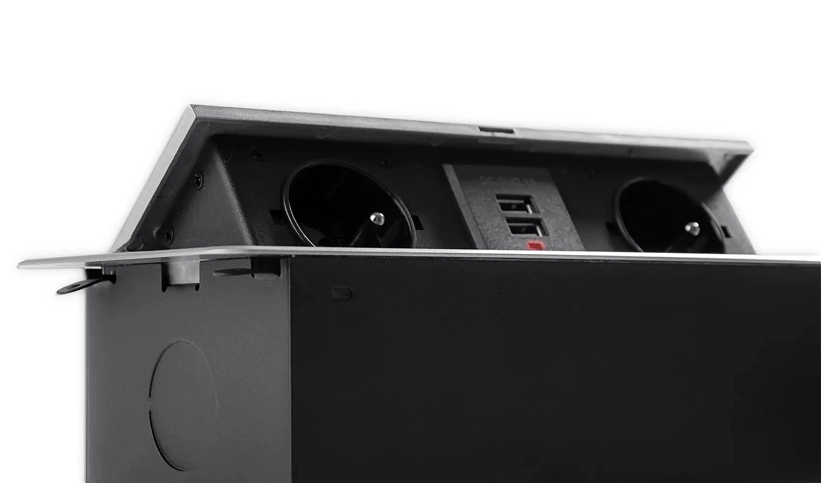 • Elegancki mediaport do montażu w blacie, otwierany przyciskiem. Posiada 2 gniazda elektryczne oraz podwójną ładowarkę USB. Długość kabla 1,5 m. W kolorze srebrnym