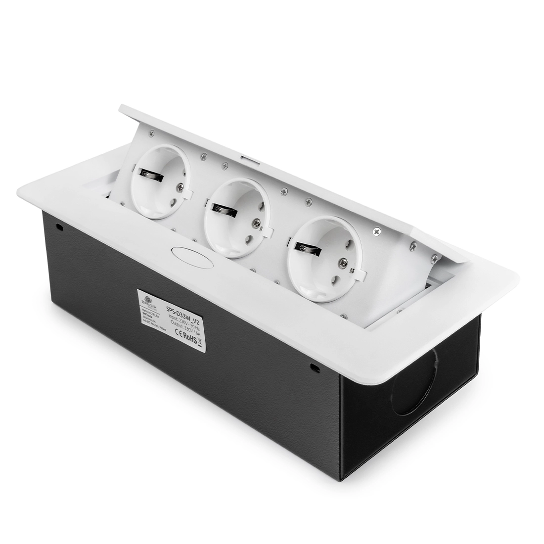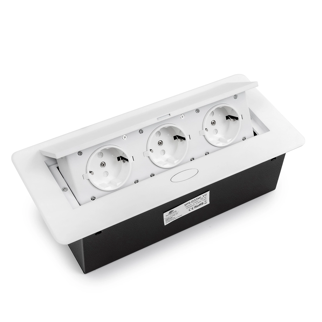 • Stylowe gniazdo chowane w blat do montażu w blacie, otwierany przyciskiem. Posiada 3 niemieckie gniazda elektryczne (typu Schuko). Długość kabla 1,5 m. W kolorze białym