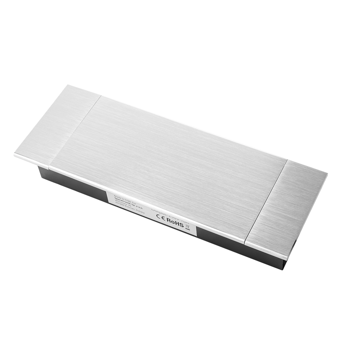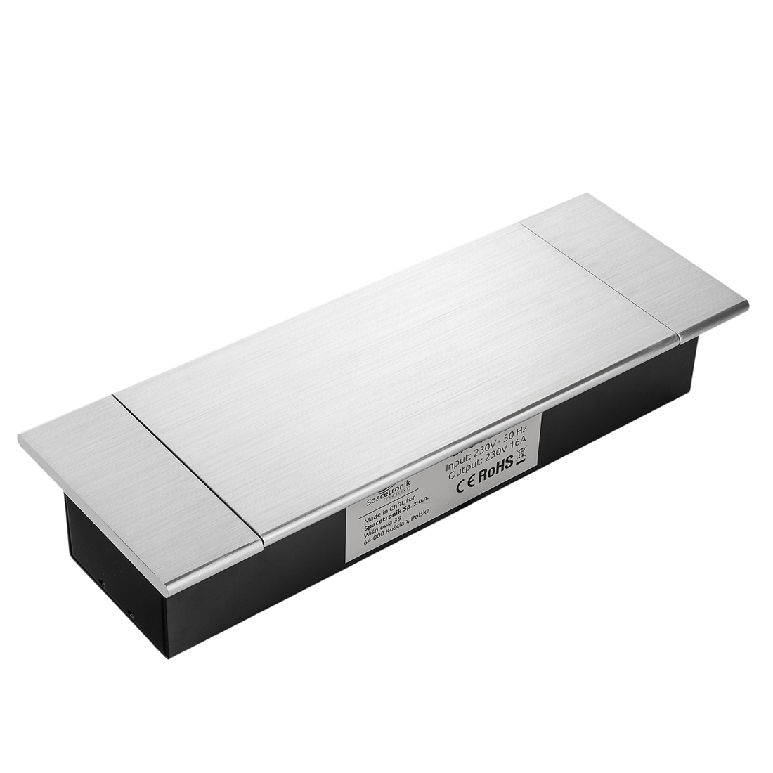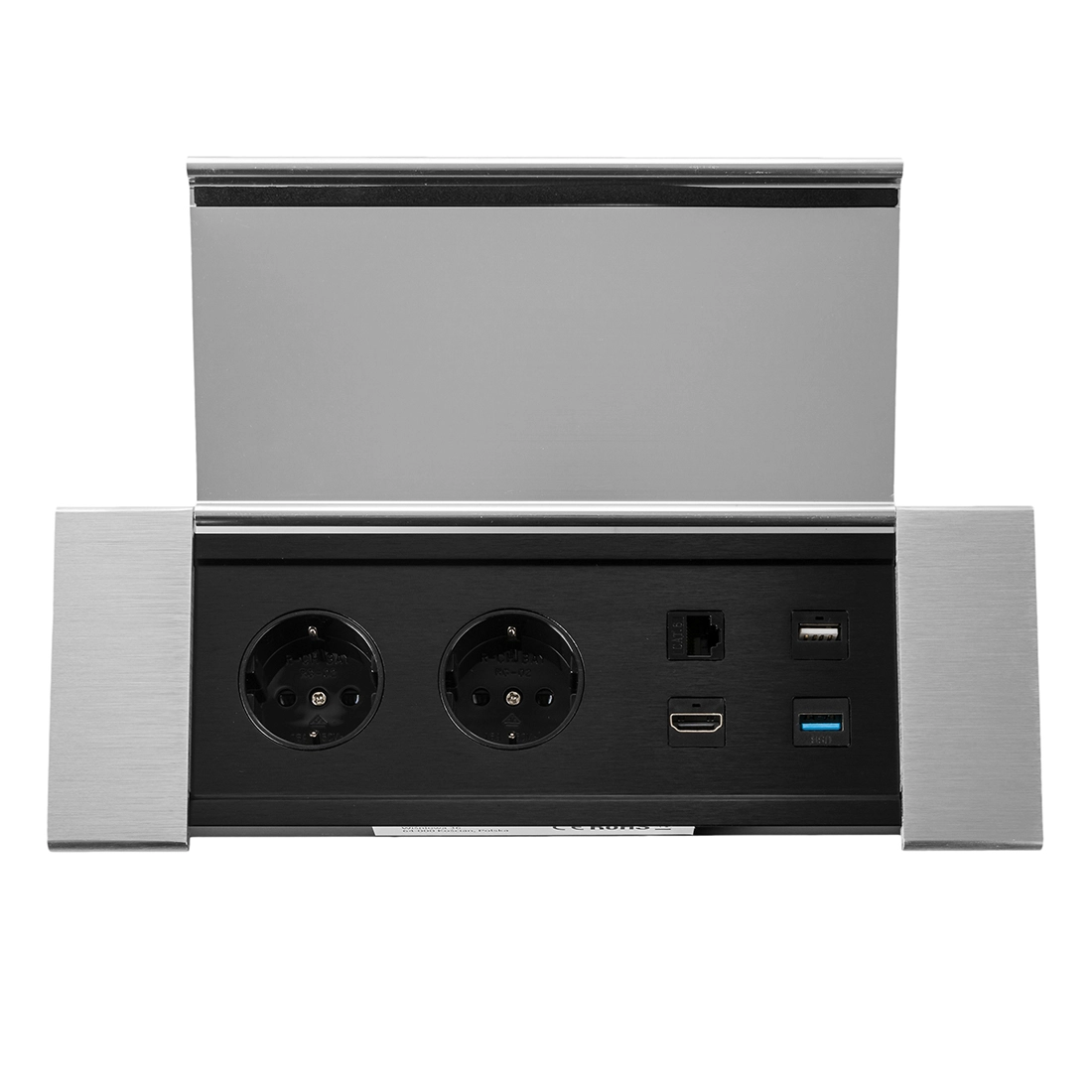 • Elegancki mediaport do montażu w blacie, z klapką. Posiada 2 gniazda elektryczne (Schuko), port HDMI, port Ethernet (RJ-45 CAT6), port USB 2.0 i 3.0. Długość kabla 1,5 m. W kolorze srebrnym.