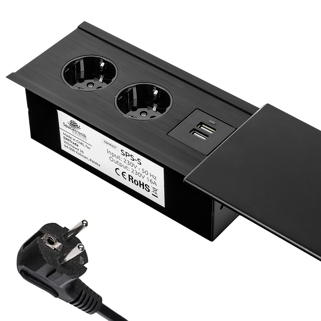 • Gniazdka chowane w blacie Spacetronik w wersji COMPACT zasuwane. Wyposażone w dwa gniazda zasilające typu niemieckiego (Schuko) oraz podwójną ładowarkę USB (2x USB-A). Długość kabla 1,5 m. W kolorze czarnym.