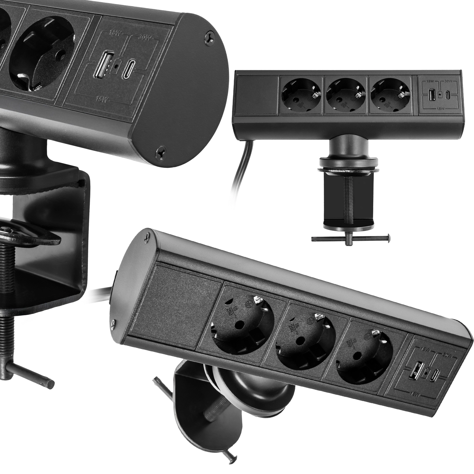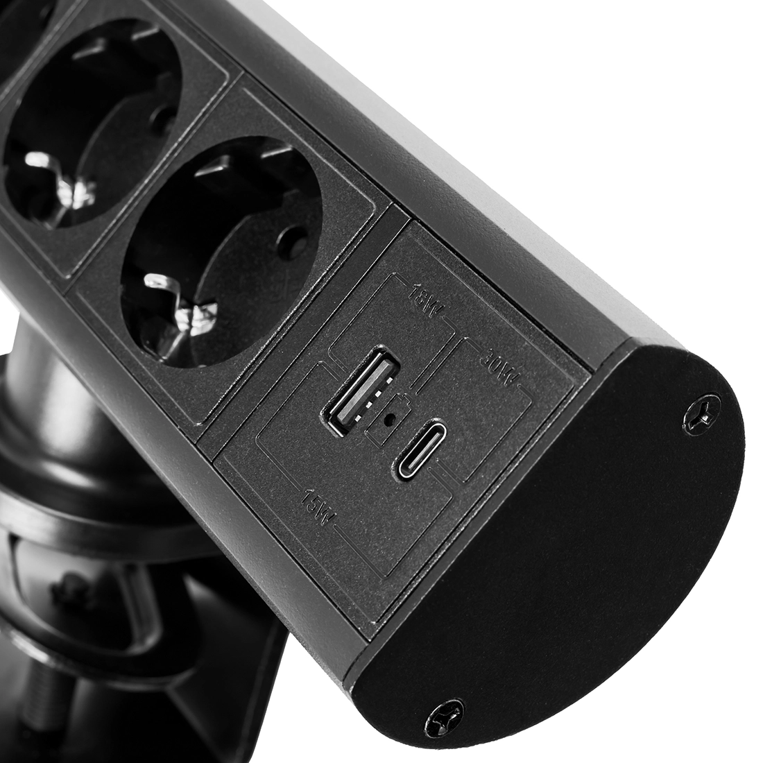 • Stylowe gniazdo nablatowe Spacetronik SPSTB51BB V2 z portami USB-A i USB-C, 3x gniazdem Schuko i kablem 1,5 m. Idealne do biura, kuchni i sali konferencyjnej. Eleganckie wykończenie w czerni, łatwy montaż i pełna funkcjonalność.
