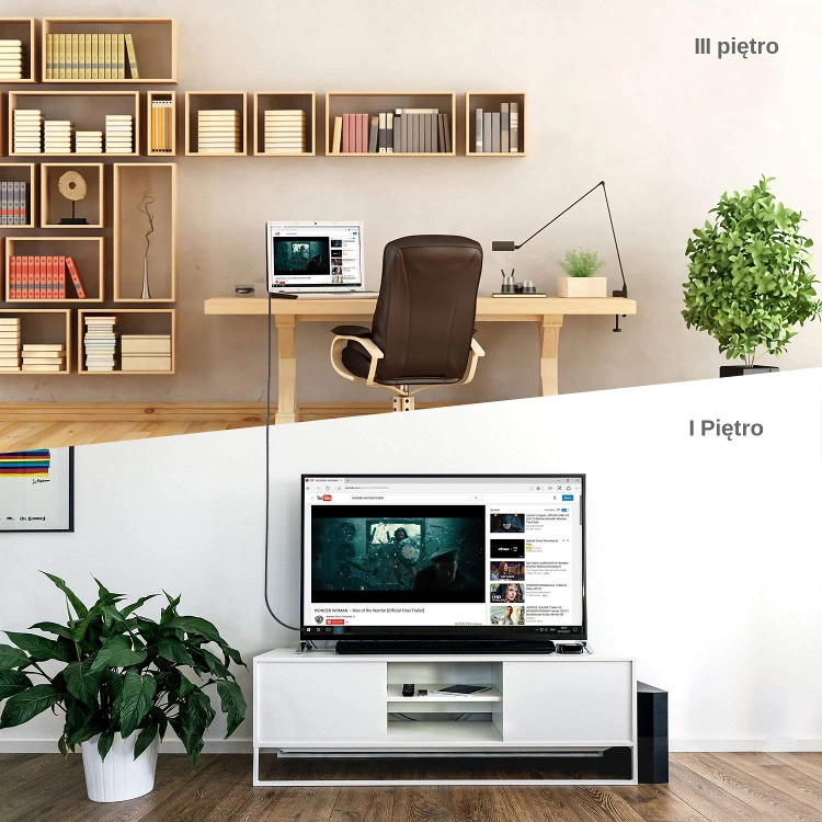 Kabel światłowodowy HDMI pozwalający przesyłać sygnał HDMI na większą odległość za pomocą kabla światłowodowego. Kabel konwertuje sygnał HDMI na optyczny i z powrotem, co pozwala na przekroczenie limitu długości, występującego w tradycyjnych kablach miedzianych. Materiał kabla wykorzystuje innowacyjną konstrukcję hybrydową, która obejmuje 4 włókna szklane i 6x przewody miedziane. Takie podejście zapewnia wysoki stopień odporności i elastyczności.