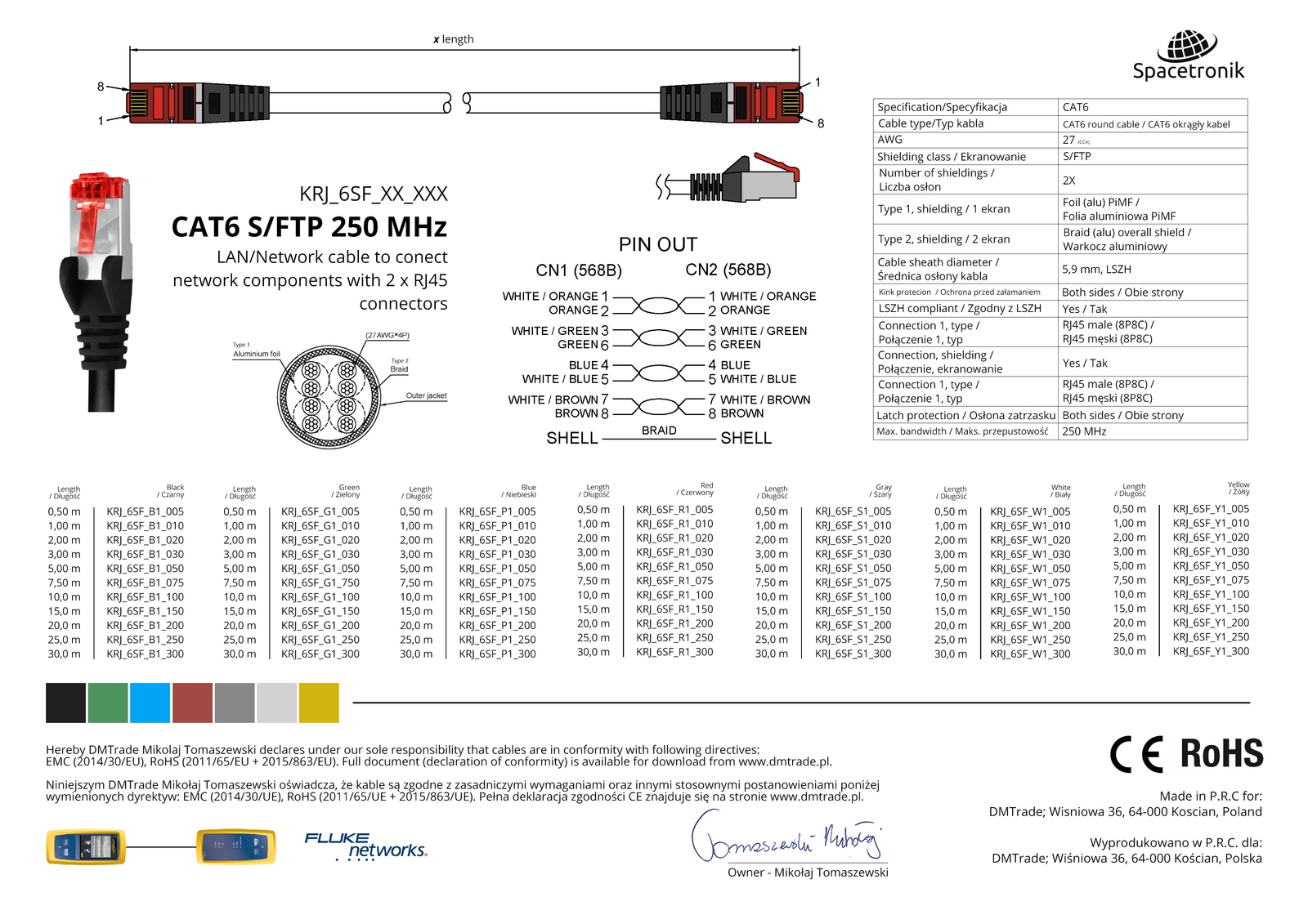 • Kabel sieciowy zakończony obustronnie wtykiem RJ45. Kategoria CAT6, ekranowany S/FTP, rdzeń CCA, AWG27, nietoksyczny LSZH