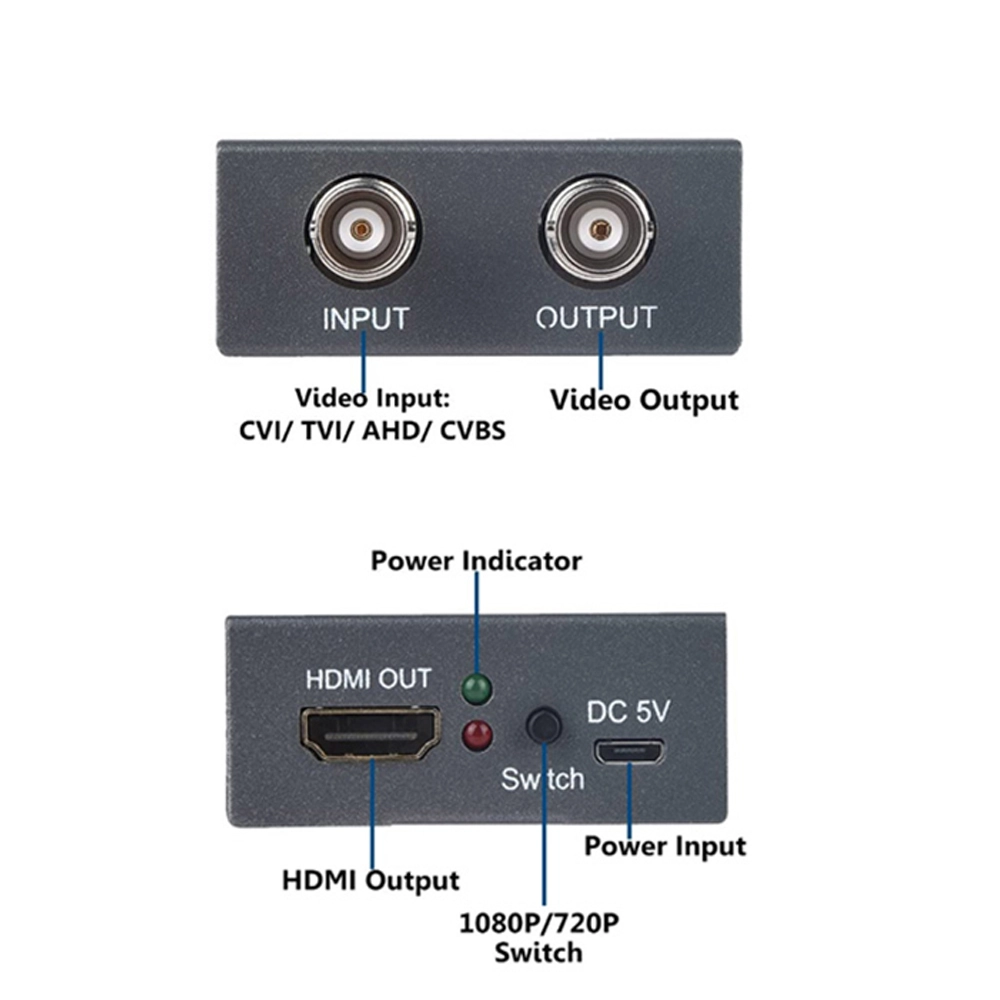 - Konwersja AHD/TVI/CVI/CVBS Konwerter interfejsu multimedialnego TVI CVI AHD CVBS umożliwia bezproblemową konwersję wyżej wspomnianych sygnałów na sygnały interfejsu HDMI 720 i 1080P HD.