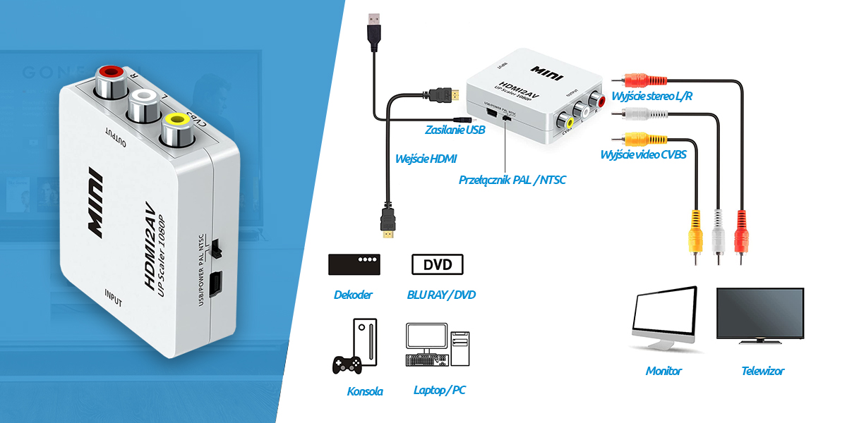 AV konwerter HDMI może konwertować format sygnału 720P / 1080P na sygnał 480i (NTSC) / 576i (PAL). Dzięki temu można go zastosować przy podłączeniu urządzenia z wyjściem HDMI pod odbiornik bez wejścia HDMI (starsze telewizory, monitory i projektory). Zasilanie USB.