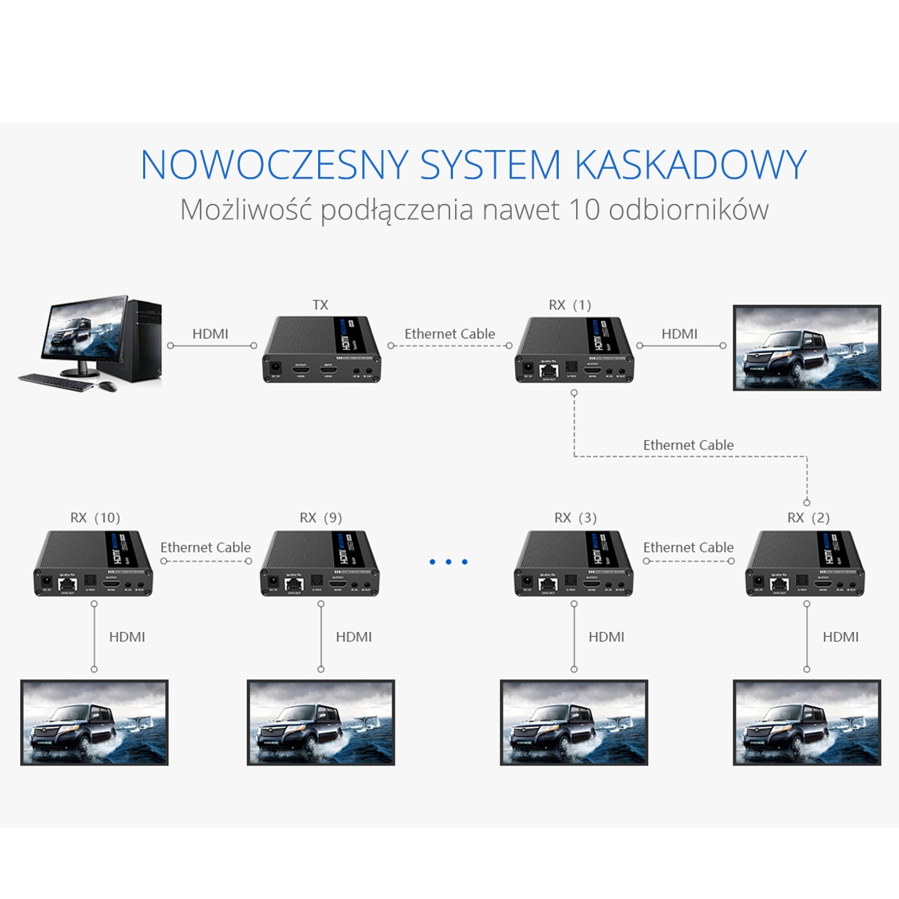 Do transmitera można podłączyć urządzenia poprzez złącze HDMI- np. kamery, PC, DVD, TV Boxy itp. Dodatkowe wyjście HDMI pozwala podłączyć monitor prosto do transmitera. Główny sygnał poprzez kabel CAT6/6A/7 jest wysłany do odbiornika na odległość do 70m. Do odbiornika można podłączyć monitor, głośnika oraz kolejny odbiornik tworząc tym samym kaskadę.