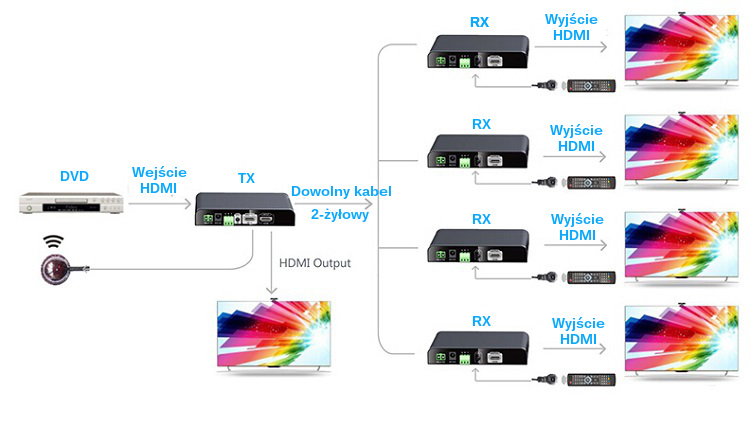 Połączenie 1 do 1: odległość transmisji do 300 metrów na dowolnych przewodach 2-żyłowych