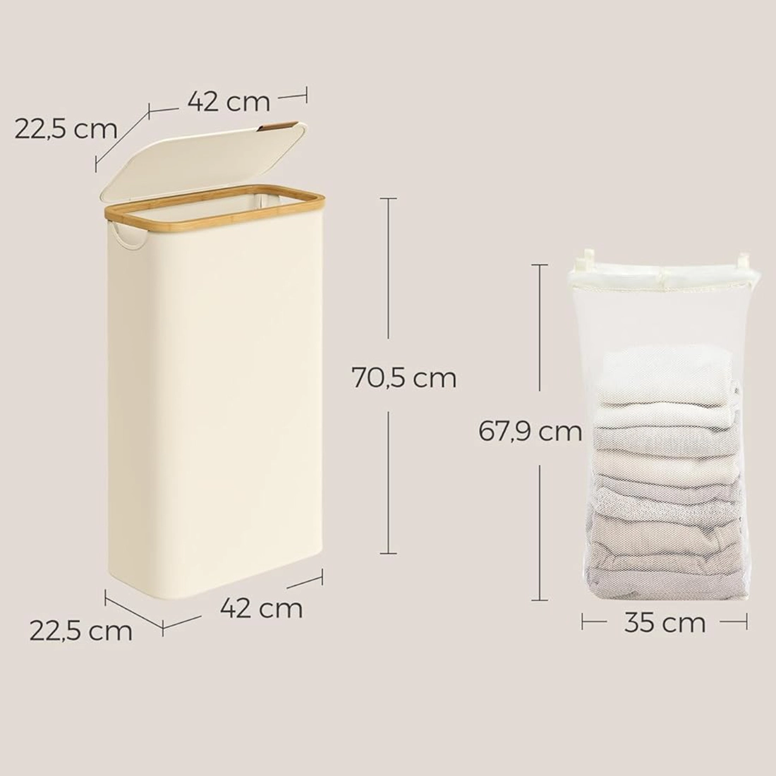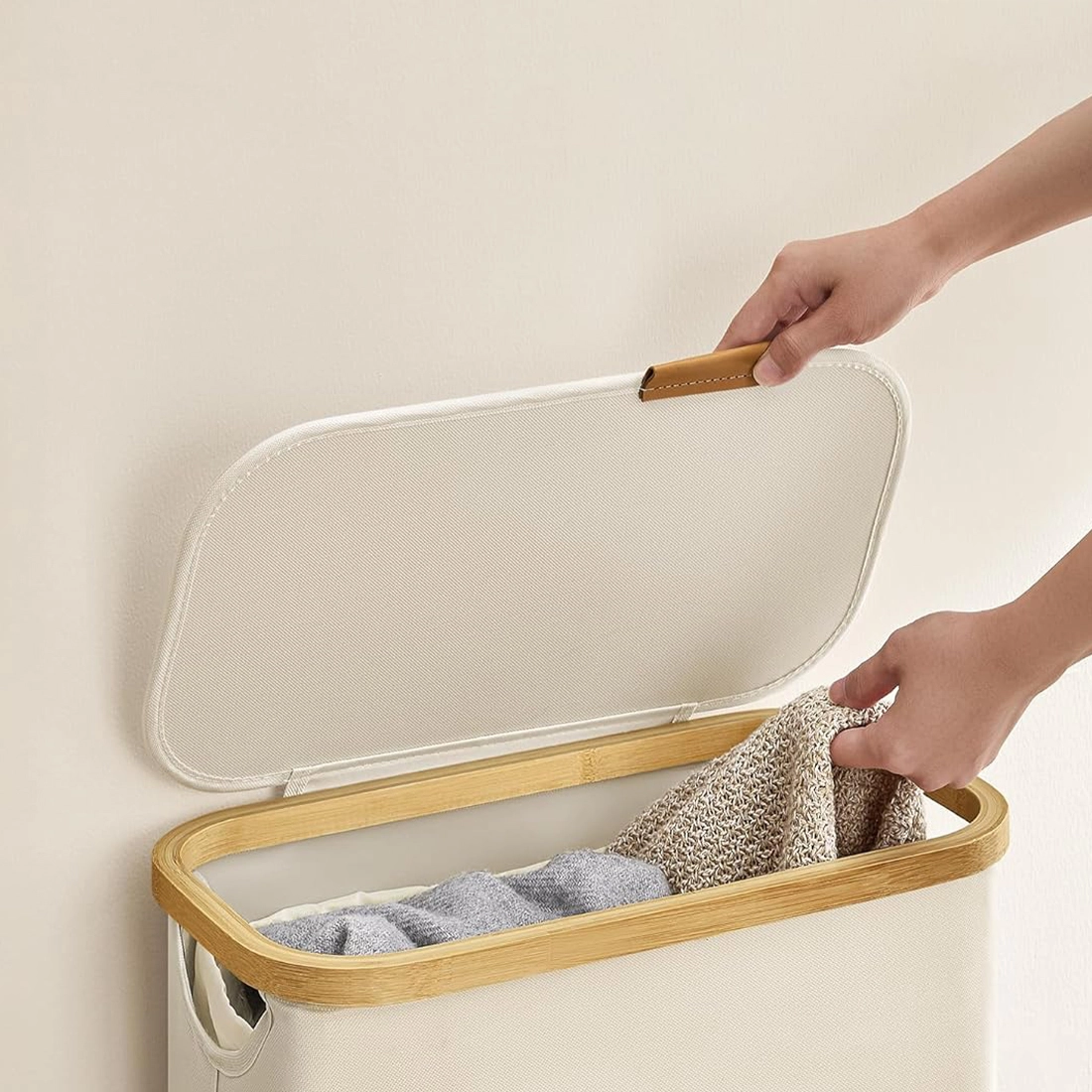 Pokrywa ogranicza widoczność zawartości i chroni pranie przed kurzem. Uchwyt z elementem skóropodobnym ułatwia otwieranie i dodaje całości eleganckiego wyglądu. Bambusowa ramka ociepla design i pasuje do nowoczesnych oraz naturalnych wnętrz.