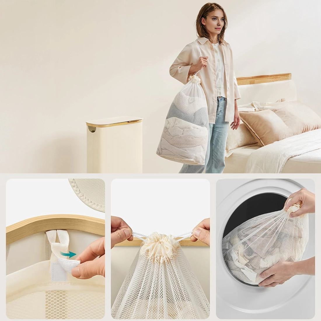 Wyjmowany worek na rzepy - wygodne przenoszenie i sortowanie prania