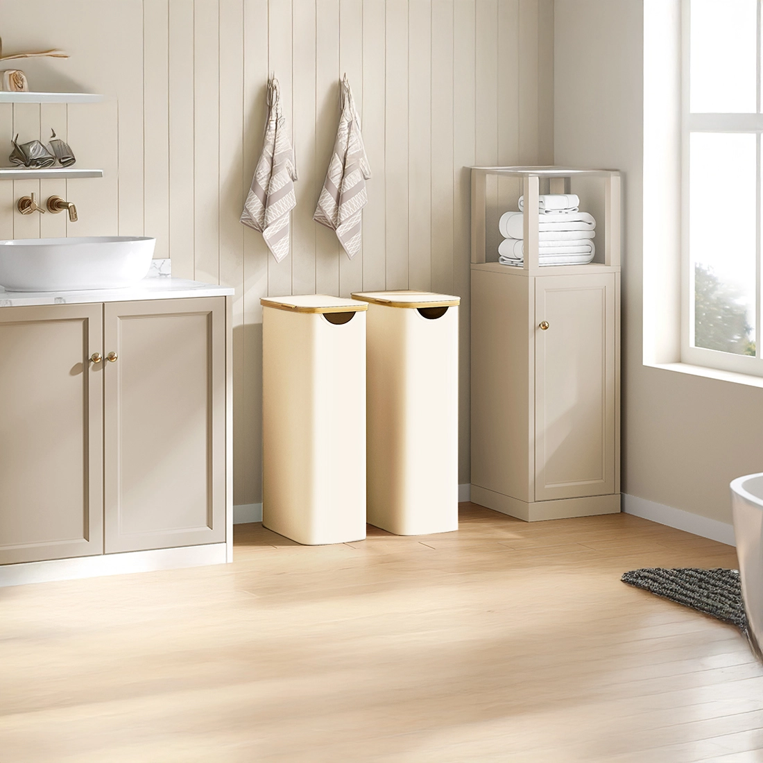Masz dość porozrzucanych rzeczy do prania i braku miejsca na ich odkładanie? Spacetronik SFFL0011_V3 to praktyczny kosz o pojemności 65 litrów, który pomaga szybko zaprowadzić porządek. Smukła, wysoka forma sprawia, że dobrze sprawdzi się w mniejszych łazienkach i wnękach, a zamykana pokrywa ukrywa zawartość. Eleganckie połączenie beżowej tkaniny i bambusa pasuje do nowoczesnych oraz naturalnych wnętrz.