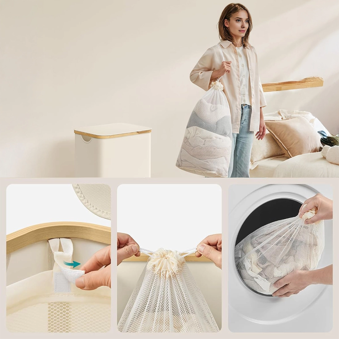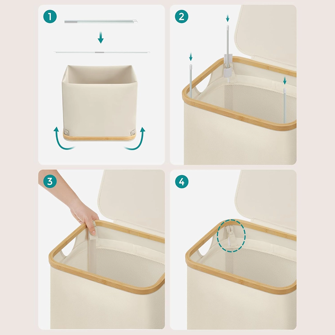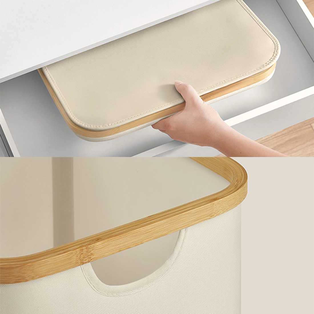 Pokrywa ogranicza widoczność zawartości i chroni pranie przed kurzem. Uchwyt z elementem skóropodobnym ułatwia otwieranie i dodaje całości eleganckiego wyglądu. Bambusowa ramka ociepla design i pasuje do nowoczesnych oraz naturalnych wnętrz.