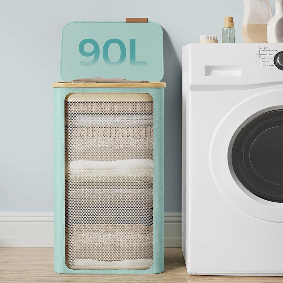 Dzięki pojemności 90 litrów kosz bez problemu mieści pranie z kilku dni. Prostokątny kształt sprawia, że łatwo ustawisz go przy pralce, w łazience lub w sypialni. To dobre rozwiązanie, jeśli chcesz mieć jedno miejsce na całe pranie bez bałaganu.