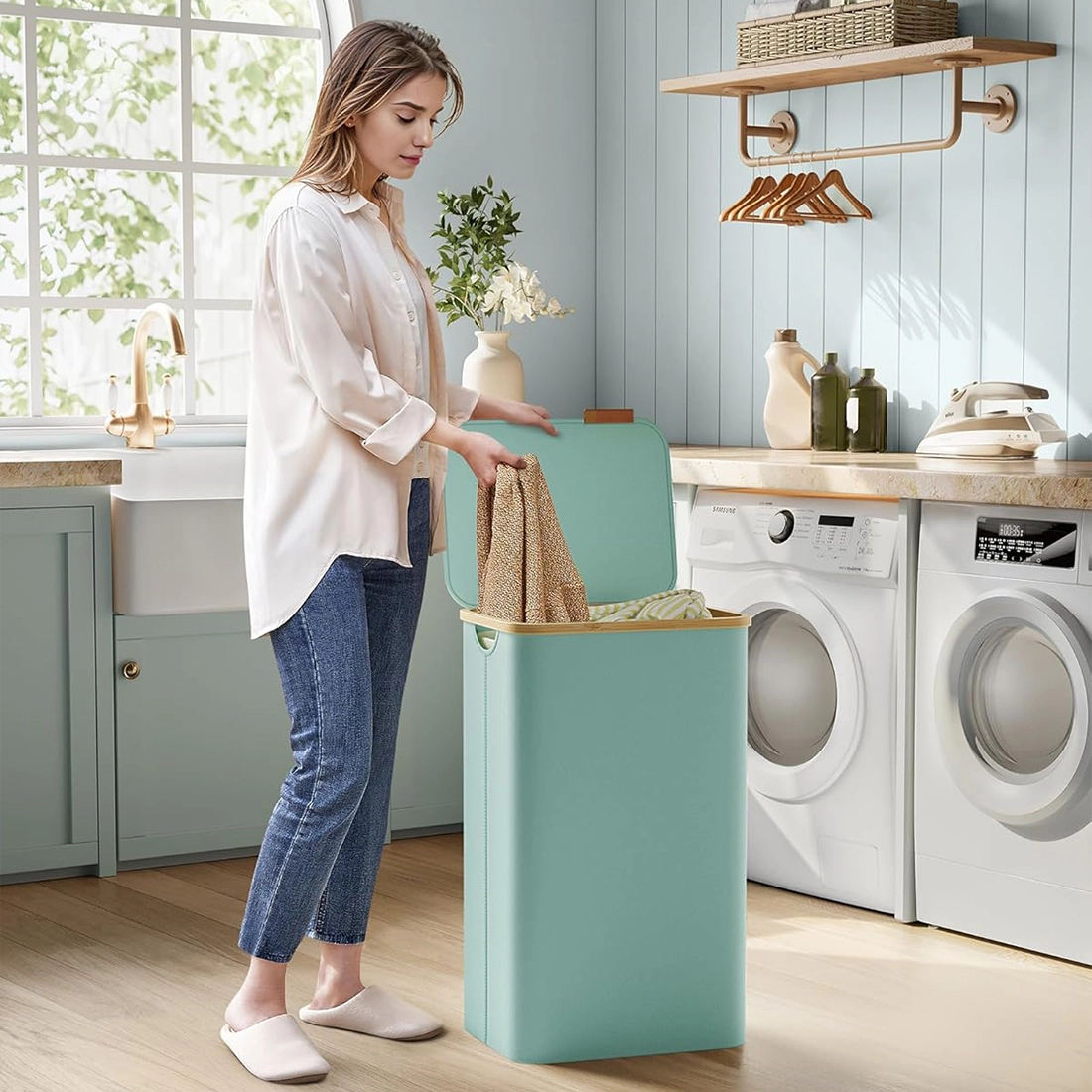 Pokrywa ogranicza widoczność zawartości i chroni pranie przed kurzem. Uchwyt z elementem skóropodobnym ułatwia otwieranie i dodaje całości eleganckiego wyglądu. Bambusowa ramka ociepla design i pasuje do nowoczesnych oraz naturalnych wnętrz.