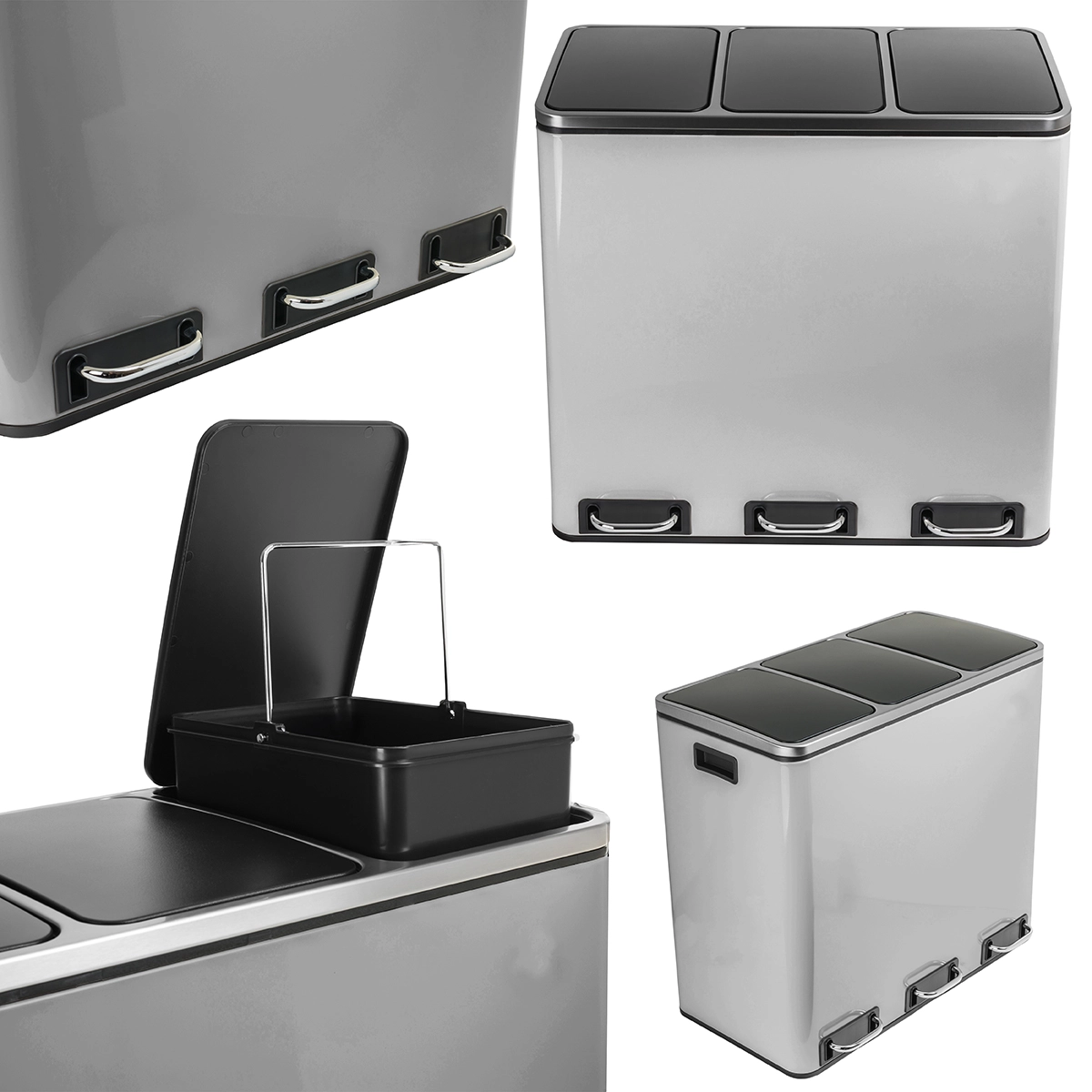 - Potrójna komora: Umożliwia łatwą segregację śmieci i recyklingu dzięki trzem oddzielnym pojemnikom.