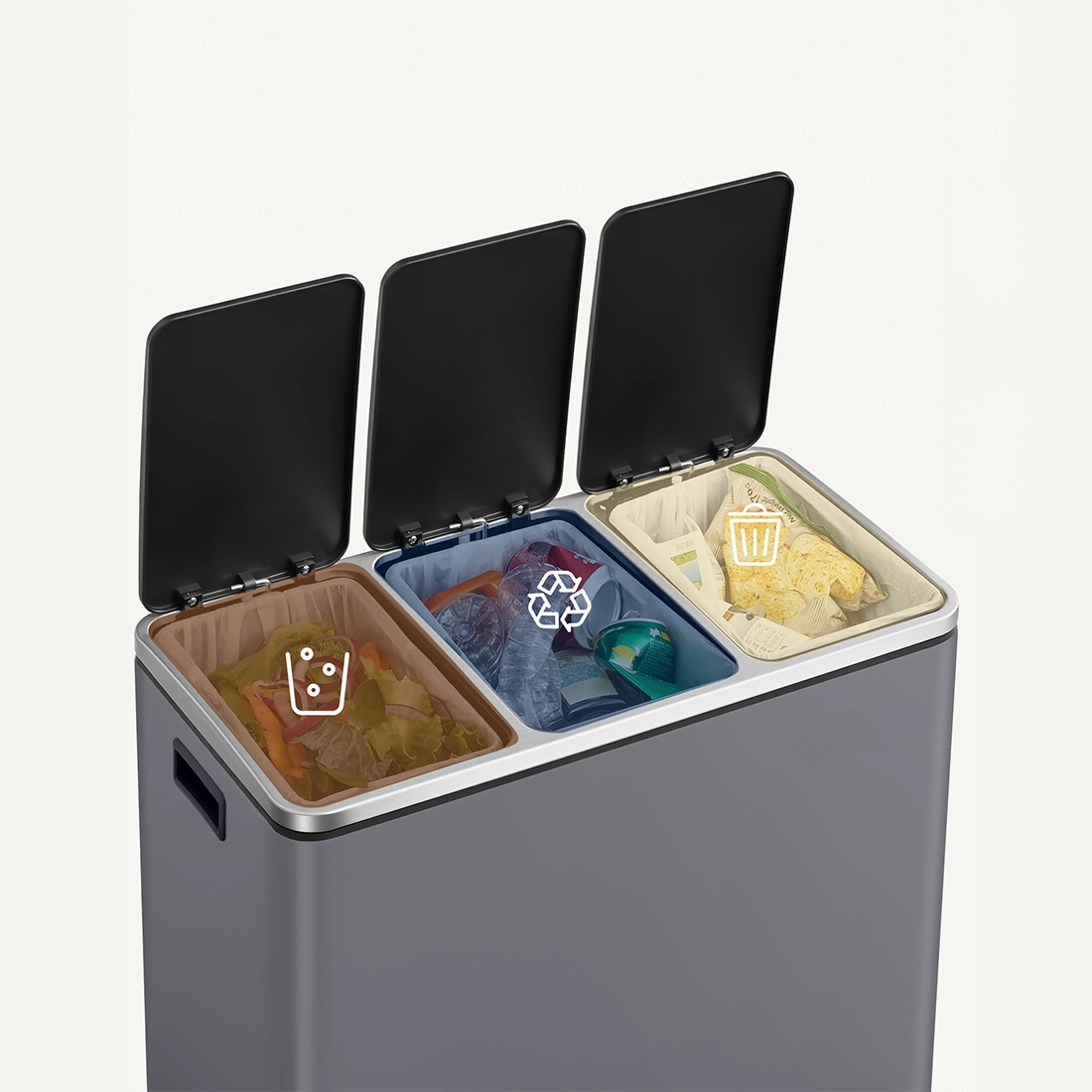 Model Spacetronik SFFT0031_V8 posiada trzy osobne komory, które ułatwiają codzienną segregację śmieci. Dzięki temu użytkownik może wygodnie oddzielać odpady zmieszane od recyklingu, co znacząco poprawia organizację i przyczynia się do dbania o środowisko. Potrójna komora pozwala też oszczędzać czas i miejsce w kuchni.