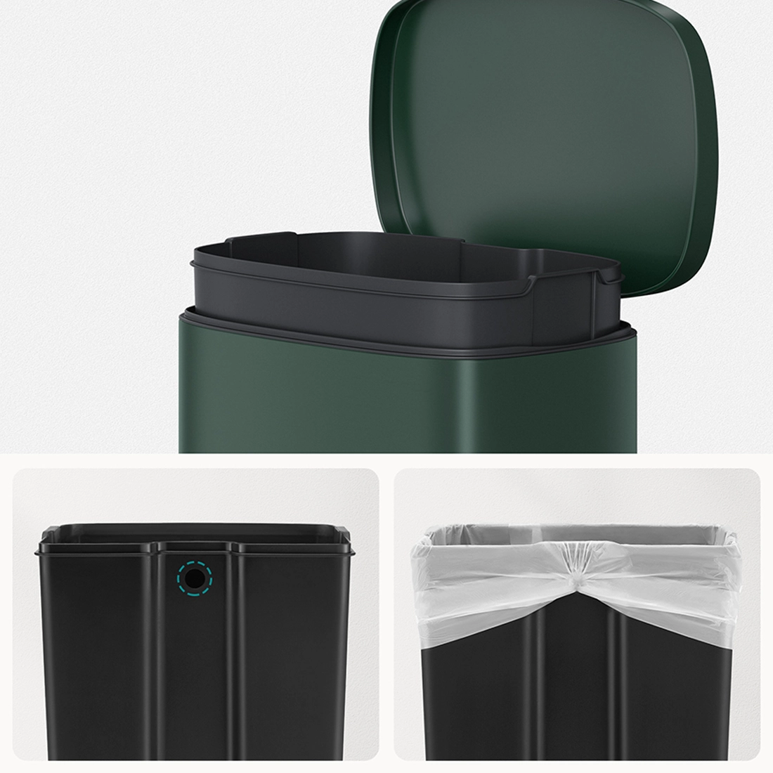 Dzięki specjalnemu systemowi mocowania, wewnętrzne wiadro pozwala na dyskretne schowanie worka na śmieci, eliminując problem nieestetycznego zwisania jego brzegów. Worek jest idealnie dopasowany i zabezpieczony, co nie tylko poprawia wygląd kosza, ale również zwiększa komfort użytkowania. To rozwiązanie, które łączy estetykę z funkcjonalnością – doskonałe do nowoczesnych wnętrz, gdzie każdy detal ma znaczenie.