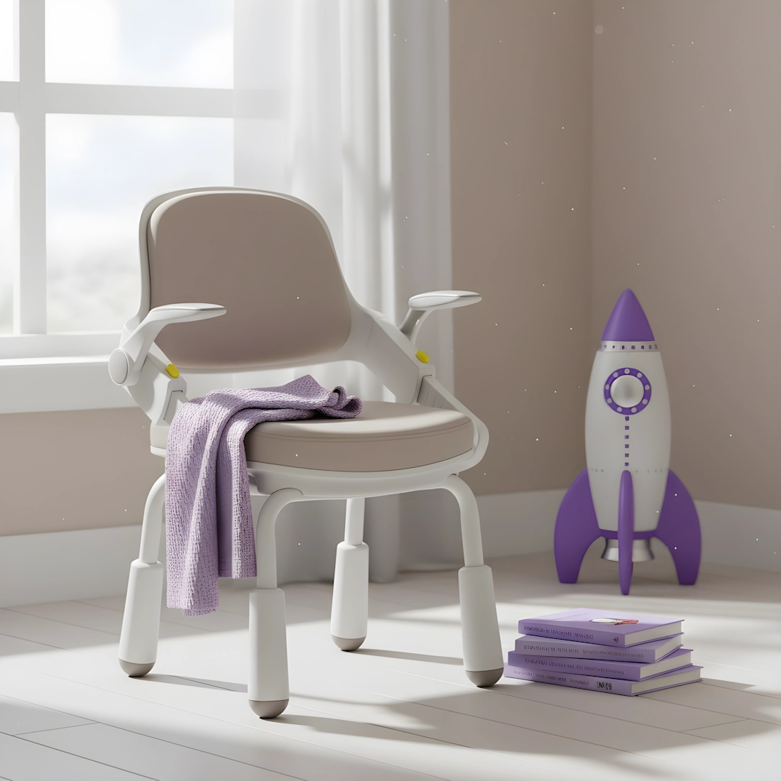 Wszystkie elementy wykonano z trwałych i bezpiecznych materiałów - od oparcia, przez solidną podstawę i ramę z wysokiej jakości tworzywa sztucznego. Zaokrąglone krawędzie, solidne nóżki i wygodne podłokietniki chronią Twoje dziecko podczas codziennego użytkowania.