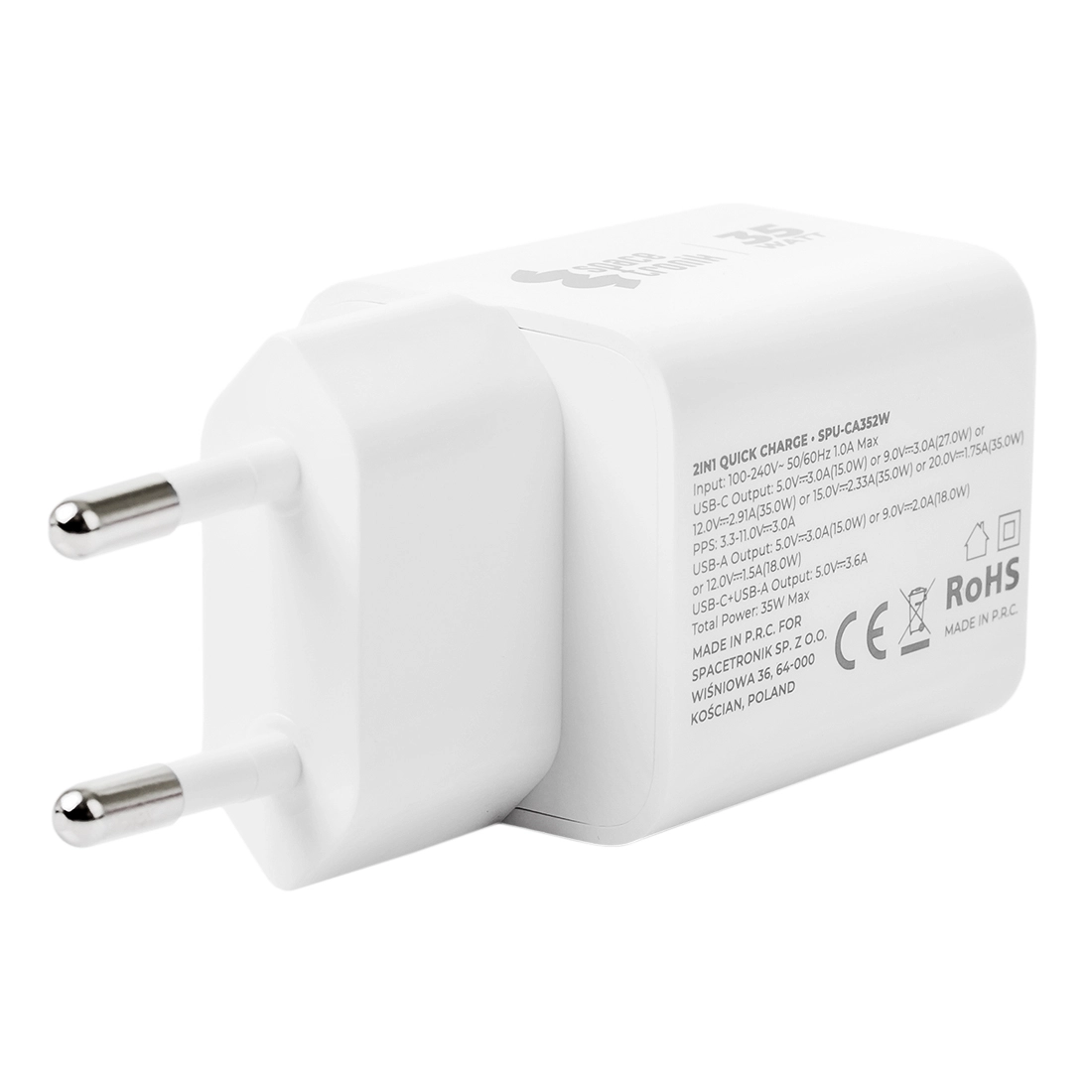 ładowarka 35W USB-C, szybka ładowarka USB-A, Power Delivery 3.0, ładowarka do laptopa, uniwersalna ładowarka Spacetronik, Quick Charge 3.6A, ładowarka z zabezpieczeniami, kompaktowa ładowarka podróżna