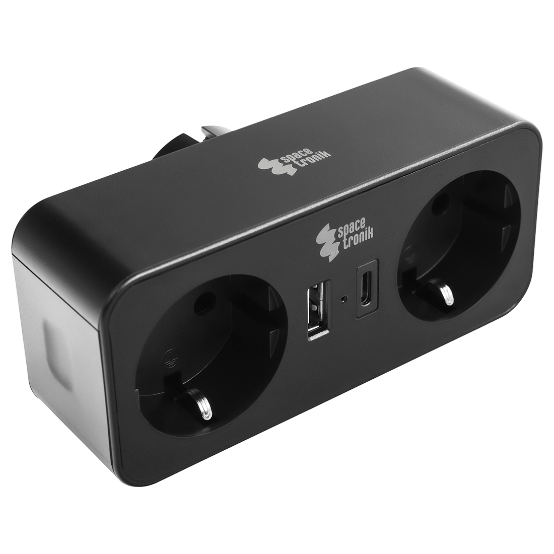 Adapter podróżny - gniazdo wtykowe Spacetronik SPSPS01B z portami USB i USB C do ładowania wielu urządzeń jednocześnie w kolorze Czarnym