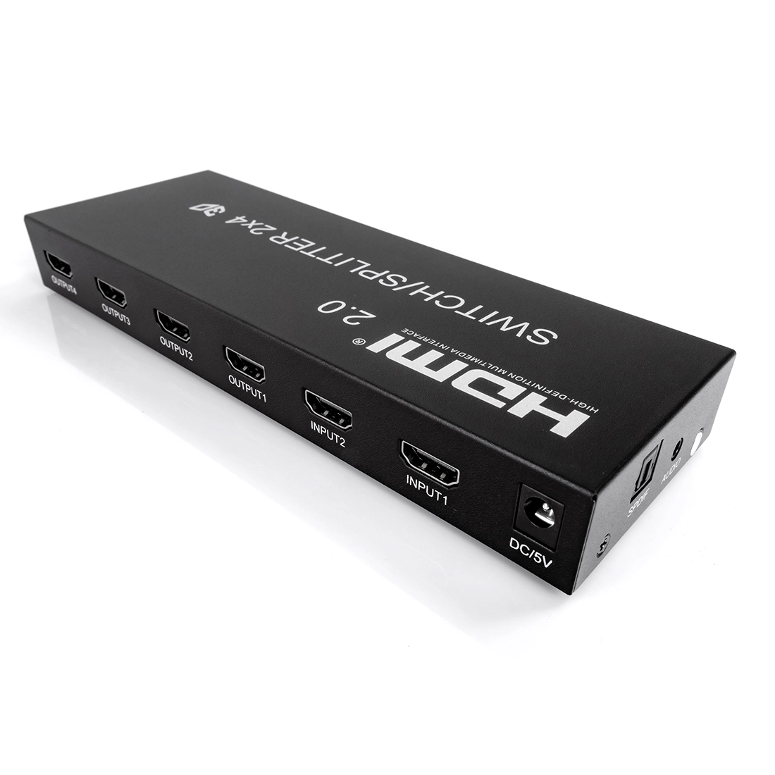 Matrix HDMI 2x4 może łączyć 2 źródła sygnału HD z 4 wyświetlaczami HD, dodatkowo urządzenie posiada wyjście toslink lub słuchawek stereo. Matrix umożliwia łatwe przełączanie lub podział dwóch urządzeń HDMI na cztery monitory lub projektory zgodne z HDMI. Porty wyjściowe mogą realizować niezależne wyjście audio przez stereofoniczny zestaw słuchawkowy. Urządzenie idealnie sprawdza się w zakresie kontroli centrum danych, dystrybucji informacji, prezentacji na sali konferencyjnej, środowisk szkolnych i szkoleniowych.