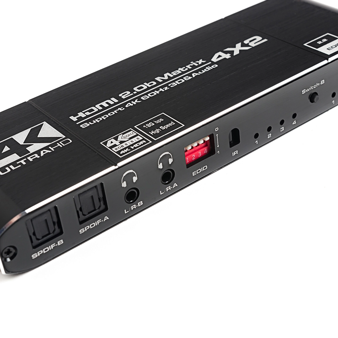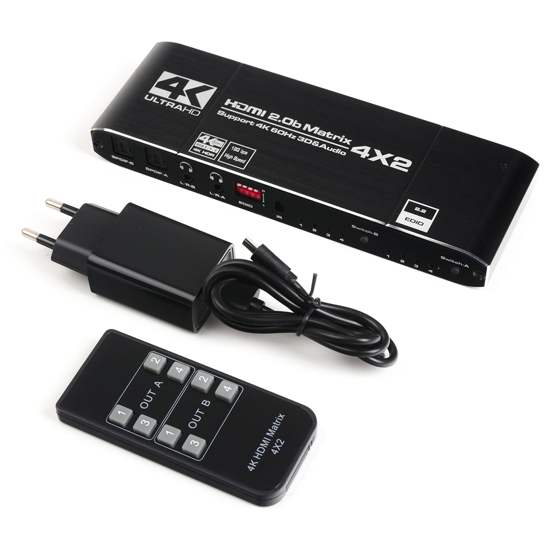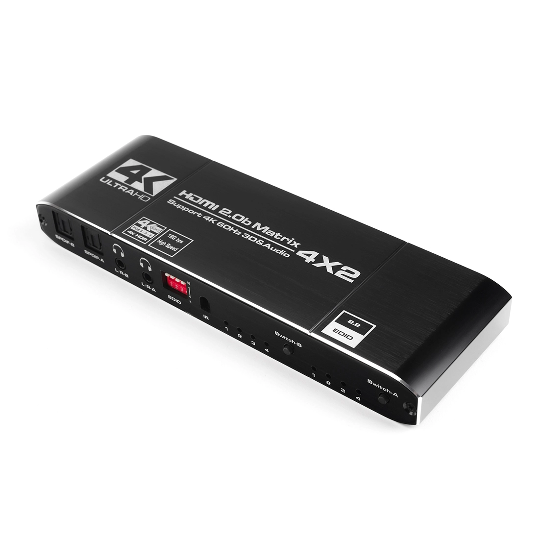 Matrix HDMI 4x2 może łączyć 4 źródła sygnału HD z 2 wyświetlaczami HD, dodatkowo urządzenie posiada wyjście toslink lub słuchawek stereo. Matrix umożliwia łatwe przełączanie lub podział dwóch urządzeń HDMI na dwa monitory lub projektory zgodne z HDMI. Porty wyjściowe mogą realizować niezależne wyjście audio przez stereofoniczny zestaw słuchawkowy. Urządzenie idealnie sprawdza się w zakresie kontroli centrum danych, dystrybucji informacji, prezentacji na sali konferencyjnej, środowisk szkolnych i szkoleniowych.