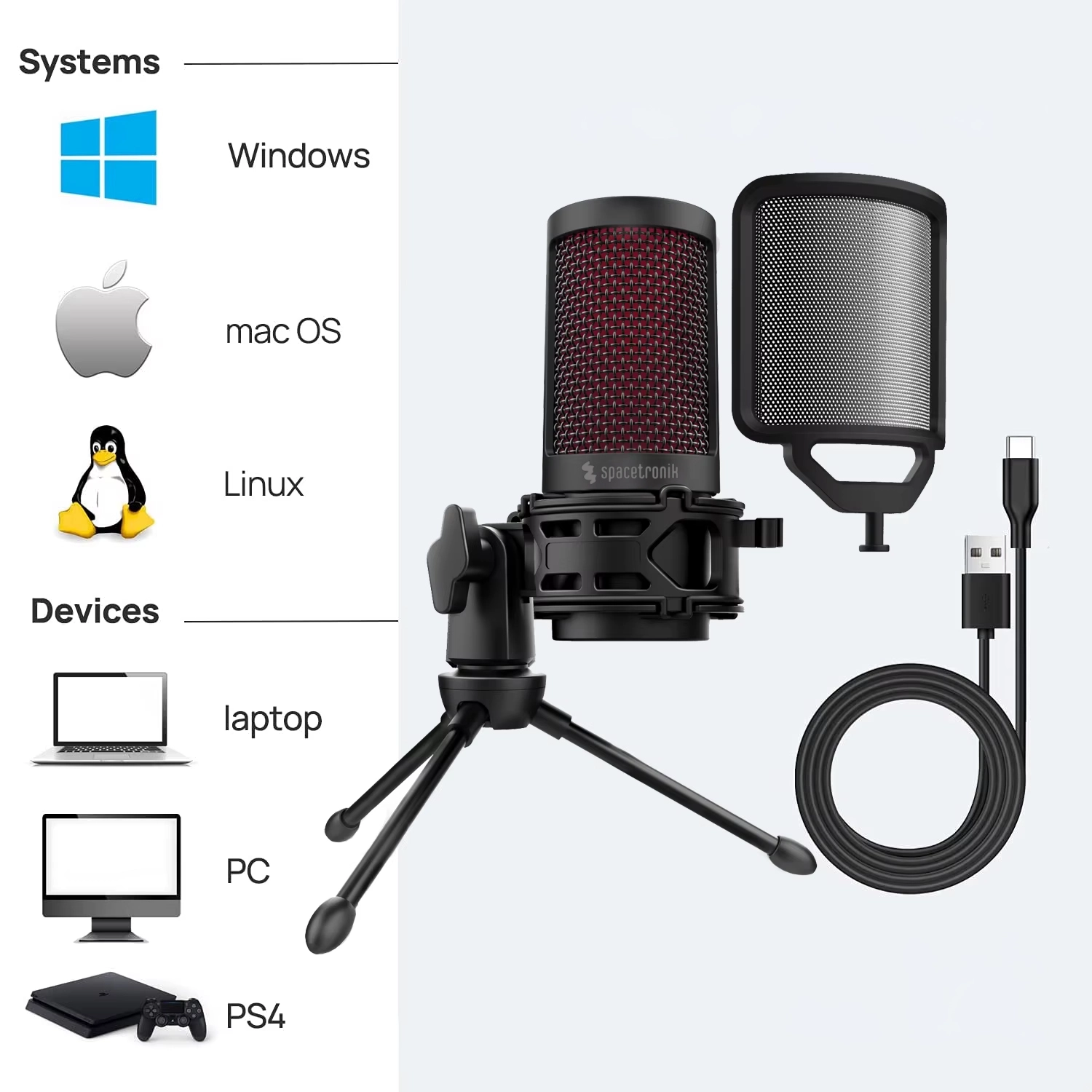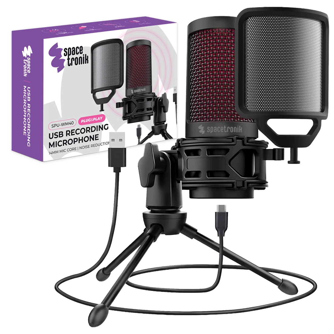 • Spacetronik SPU-WM40 to mikrofon USB o charakterystyce kardioidalnej, idealny dla graczy i streamerów. Zestaw zawiera pop filtr, uchwyt antywibracyjny i funkcję Tap-to-Mute. Kompatybilny z PC, Mac i PS4/5.
