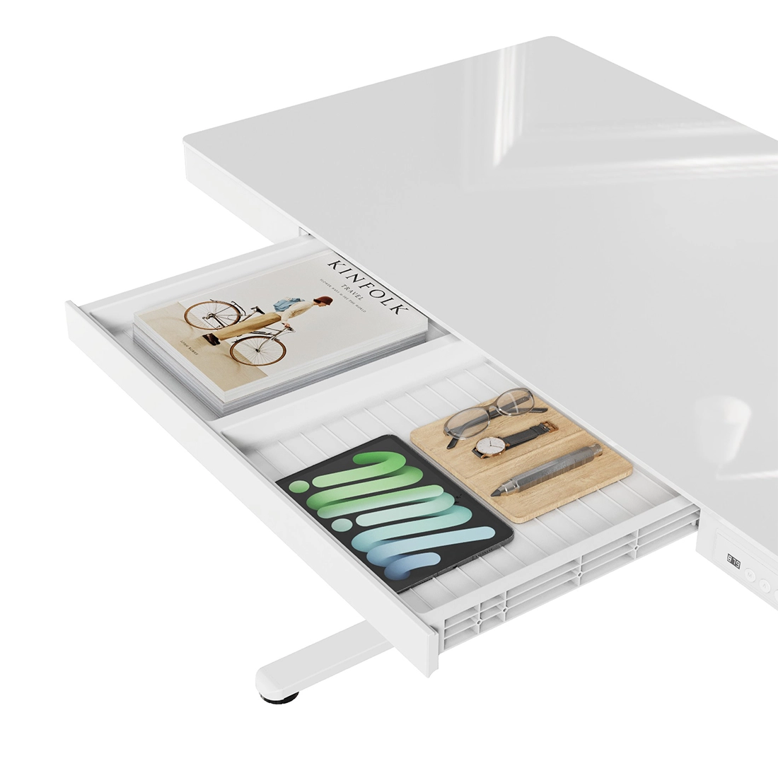 Skończ z bałaganem i poszukiwaniem wolnych gniazdek. Biurko SPEB142 zostało zaprojektowane, by stać się sercem Twojego ekosystemu. Zintegrowane porty USB i USB-C pozwalają na jednoczesne ładowanie smartfona, słuchawek czy pada do gier, eliminując potrzebę stosowania dodatkowych ładowarek i przedłużaczy. A gdy potrzebujesz idealnego porządku? Dyskretna, wbudowana szuflada to genialne rozwiązanie na wszystkie drobiazgi – notatniki, długopisy czy akcesoria gamingowe. Wszystko ma swoje miejsce, a Twój blat pozostaje czysty i gotowy do działania.