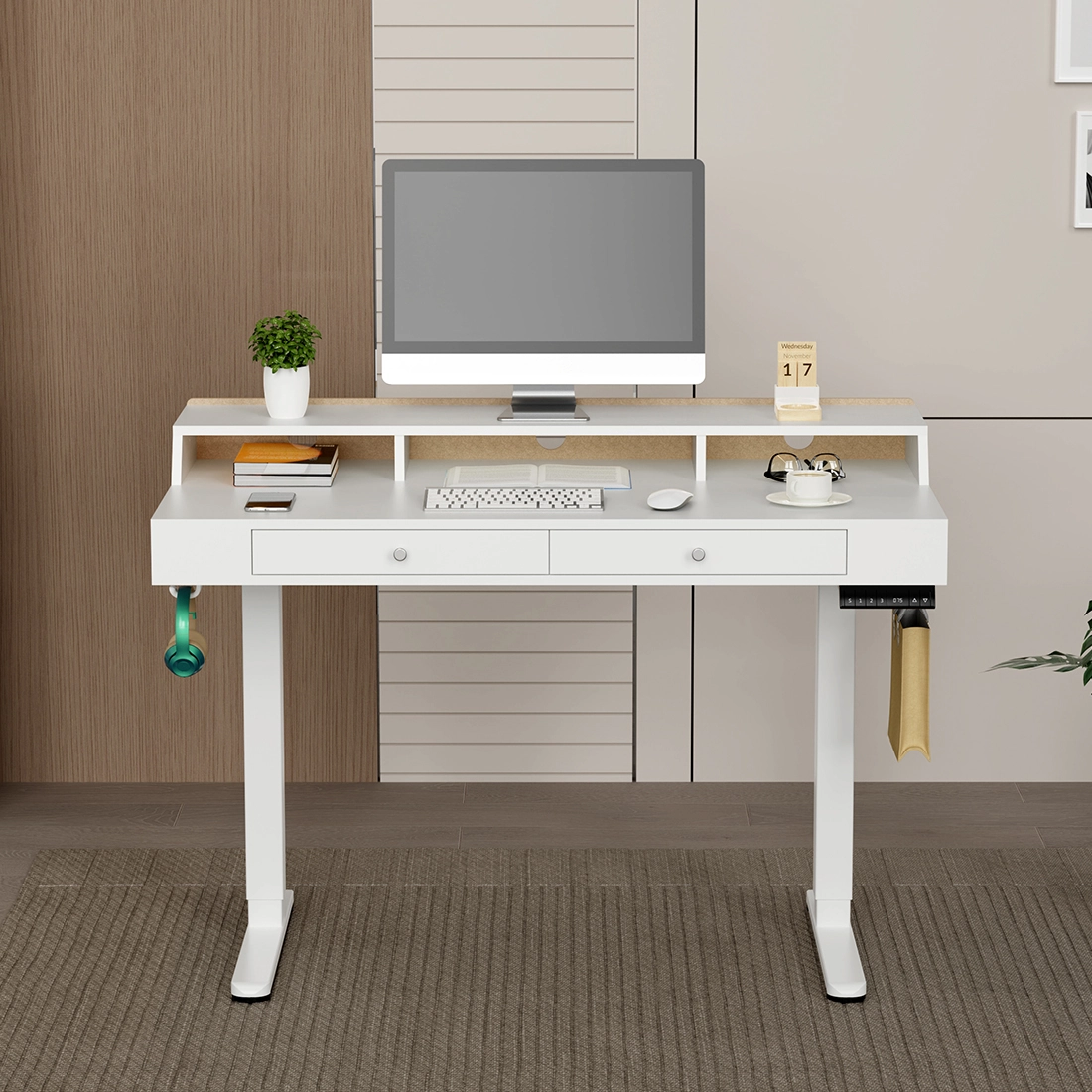 • Biurko Spacetronik SPEF141WL_120_60 z elektryczną regulacją wysokości, podwójnym blatem i wbudowaną szufladą. Pojedynczy silnik zapewnia cichą pracę, a pamięć ustawień i system antykolizyjny zwiększają komfort i bezpieczeństwo.