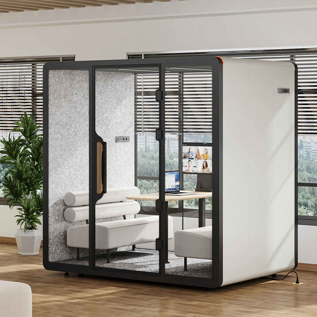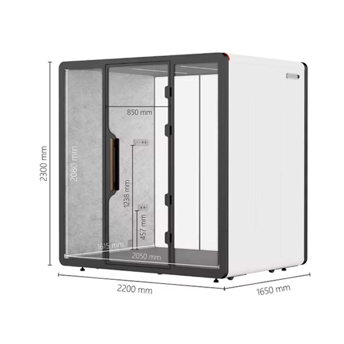 Izolacja akustyczna - 25–31 dB, dzięki zastosowaniu specjalnych paneli wygłuszających budka skutecznie redukuje hałas zewnętrzny, zapewniając prywatność rozmów i komfortowe warunki do pracy, spotkań i wideokonferencji.