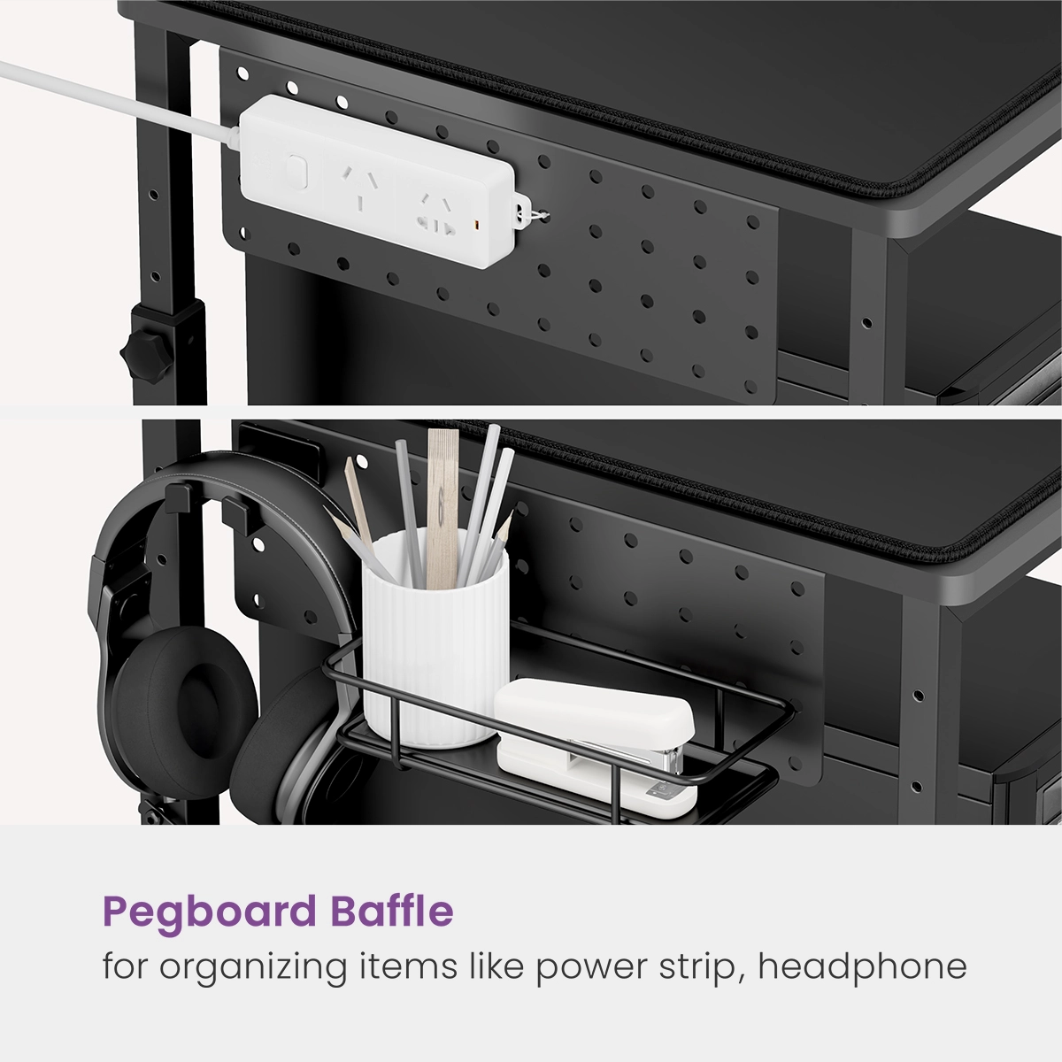 - Dodatkowe Przestrzenie Magazynowania: Górna półka i perforowana przegroda zapewniają dużo miejsca na przechowywanie i organizację przestrzeni roboczej.