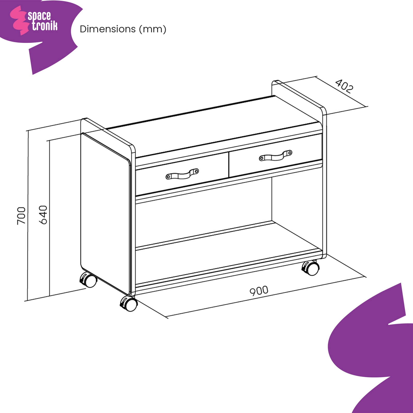 • Wielofunkcyjna szafka na kółkach Spacetronik to idealne rozwiązanie dla wszystkich osób szukających uniwersalnych rozwiązań. Dzięki jej mobilności będziesz mógł korzystać z niej, gdzie tylko zechcesz. Wyposażona w 2 szuflady i pojemną półkę.