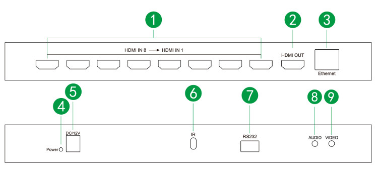 1. HDMI IN8 - HDMI IN1 --- Interfejs wejściowy