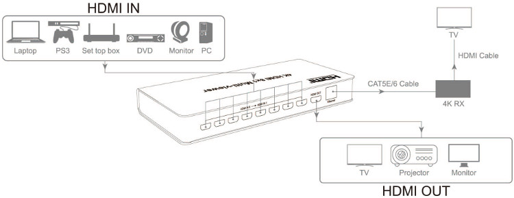 - Obsługa 8 wejść HDMI, jedno wyjście HDMI