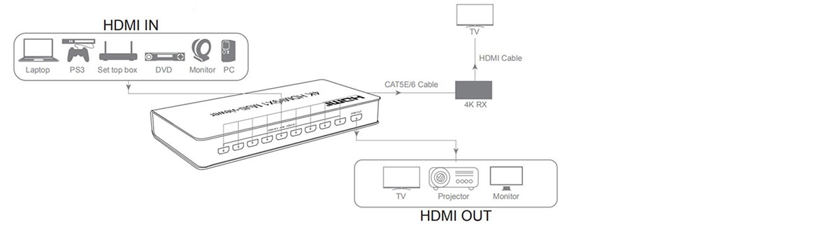 - Obsługa 9 wejść HDMI, jedno wyjście HDMI