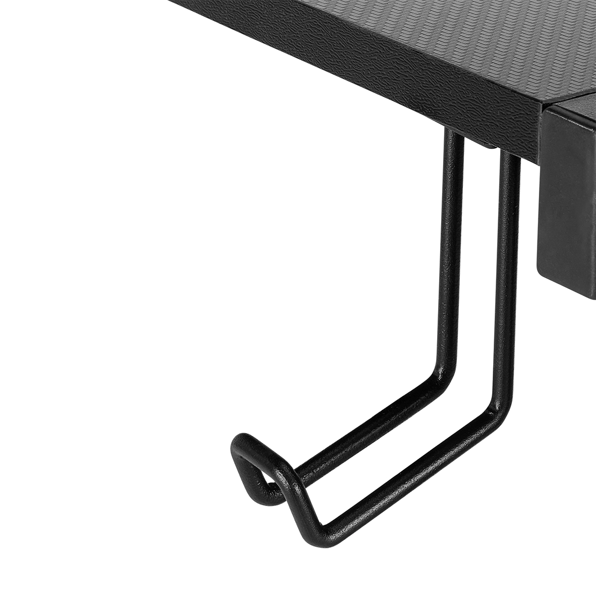 Dedykowane uchwyty na akcesoria – haki na słuchawki i kubek pod blatem uwalniają miejsce na biurku i chronią elektronikę przed przypadkowym zalaniem.