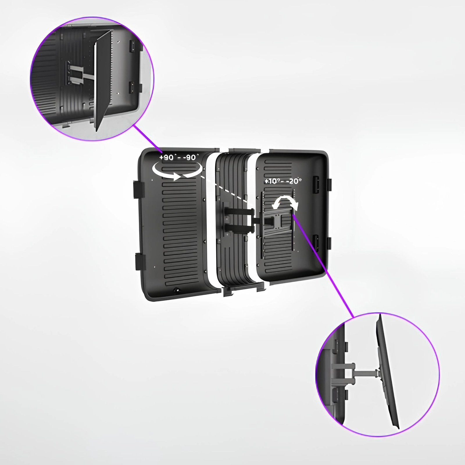 Obudowa na telewizor Spacetronik SPE-T20_75 pasuje do większości telewizorów w przedziale od 55 do 75 cali. Dodatkowo jest ona zgodna ze standardem VESA 200x200, 300x200, 400x200, 300x300, 400x300, 400x400, 600x400. By zapewnić Ci pełną swobodę z korzystania z urządzenia, ekran nachyla się w zakresie +10~-20°. Możesz go również obracać o 90° w obu kierunkach. Poziom natomiast ustawisz w przedziale od +3 do -3°.