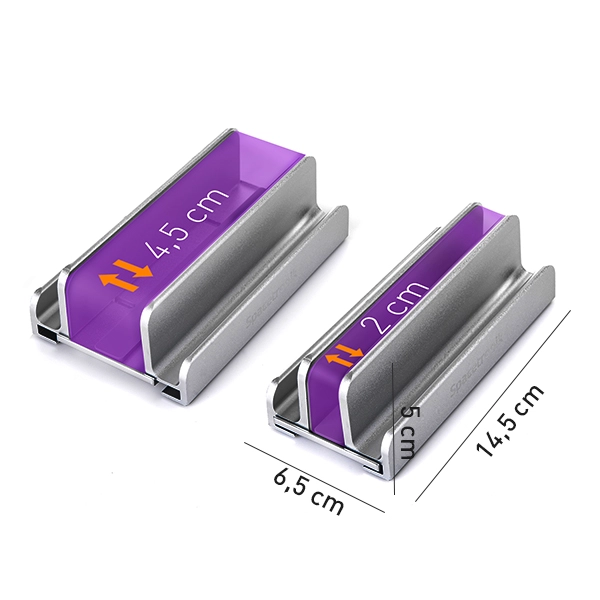 Bez różnicy czy masz grubego laptopa, czy wąskiego Maca, podstawka od Spacetronik posiada regulację szerokości uchwytu od 2 do 4,5 cm. Oprócz tego znajdują się w nim 2 miejsca na telefony komórkowe (każdy model się zmieści)