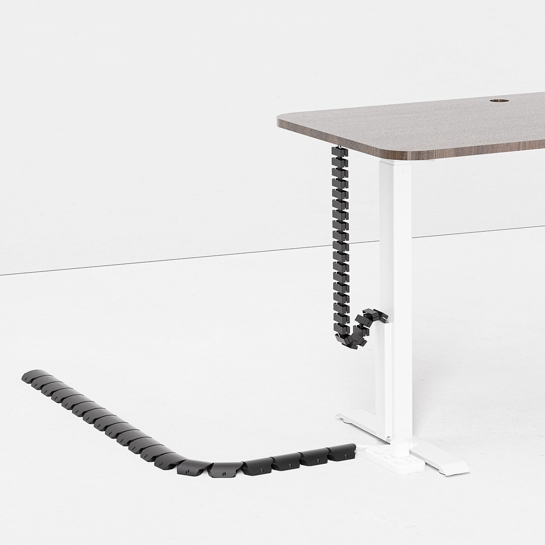 Modułowa budowa prowadnicy kablowej umożliwia ułożenie listwy w linii prostej lub pod kątem (np. przy biurkach narożnych). Każdy segment łączy się na klik, co pozwala dopasować długość i kształt do rzeczywistych potrzeb. Czarna kolorystyka sprawia, że organizer wtapia się w otoczenie i nie rzuca się w oczy. Pozwala zachować minimalistyczny wygląd przestrzeni.