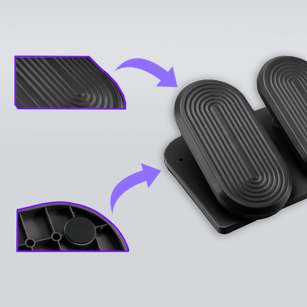 Podstawka pod stopy SPE-M08G została wykonana z połączenia stali w kolorze szarym i solidnego ciemnego plastiku. Podnóżek został wyposażony w dwa pedały, na które możesz naciskać oddzielnie od siebie. Ich powierzchnia została odpowiednio wyrzeźbiona, żeby stymulować organizm i jeszcze skuteczniej Cię relaksować. Dodatkowo podstawa urządzenia jest wyposażona w antypoślizgowe podkładki, które zabezpieczą Twój mini stepper przed przemieszczaniem się w trakcie ćwiczeń. Kolejnym atutem takiego rozwiązania jest, fakt, że podkładki antypoślizgowe zapobiegną zarysowaniu powierzchni, na której znajduje się podnóżek.