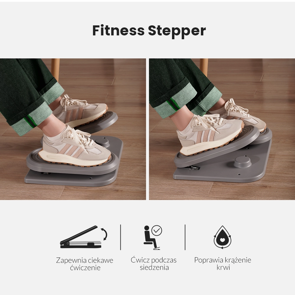 W ciągu dnia często ciężko jest znaleźć czas na trening. Praca, szkoła czy też obowiązki domowe sprawiają, że regularne ćwiczenia stają się sporym wyzwaniem, przez co ciężko jest zachować formę i zdrową kondycję organizmu. Z pomocą przychodzi podnóżek pod nogi SPE-M08G z funkcją fitness. Z uwagi na niewielkie wymiary jest prosty do przenoszenia, więc możesz mieć go przy sobie nawet w podróży. Budowa podstawki pod nogi z funkcją mini steppera pozwala na ćwiczenie w pozycji siedzącej, co umożliwi Ci odbycie treningu nawet w trakcie pracy w biurze.