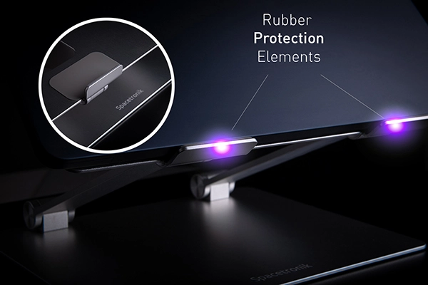 Podstawka została wyposażona w gumowane podkładki w newralgicznych miejscach.  Tym samym zabezpieczając przed porysowaniem nie tylko biurko, ale również samo urządzenie.